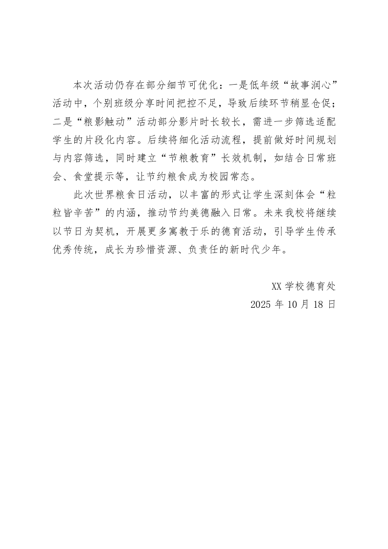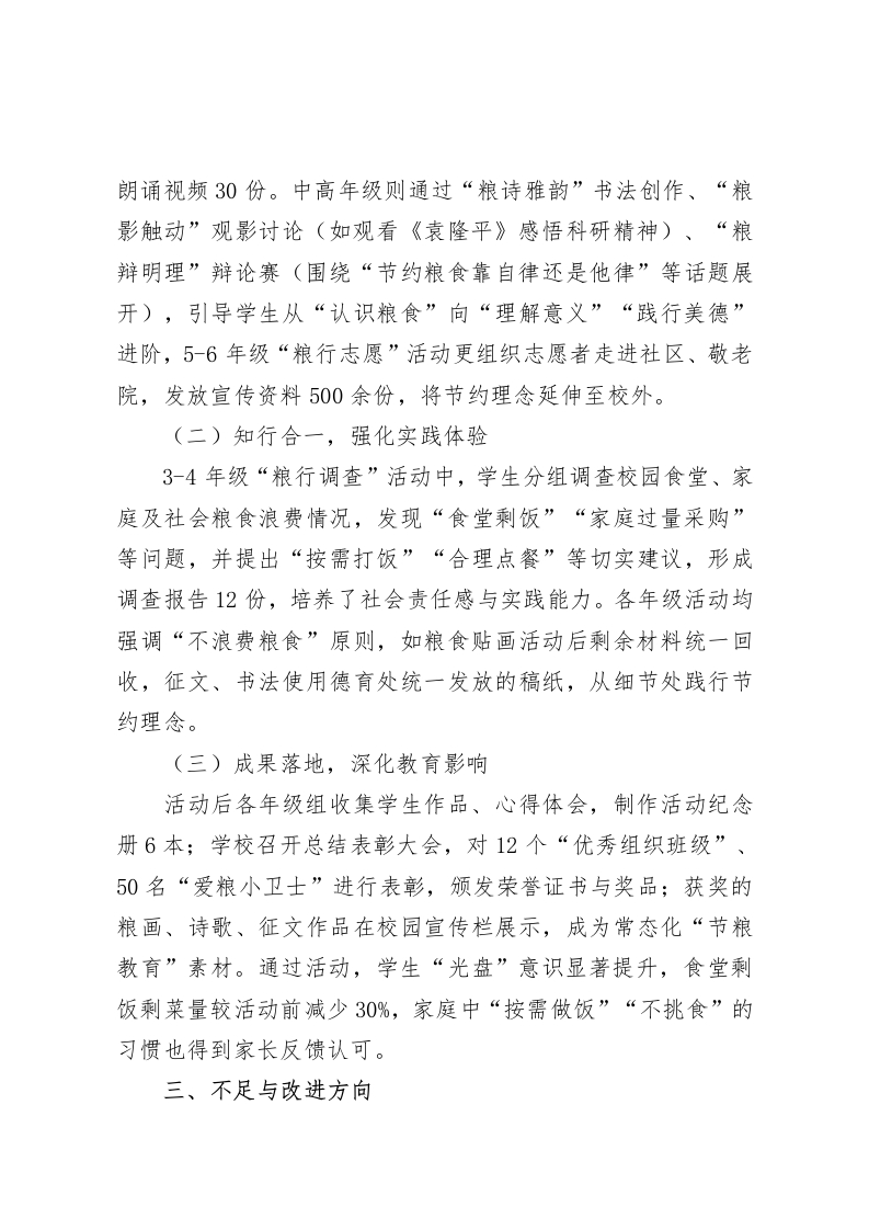 珍惜‘食”光,不负‘粮’心”2025年世界粮食日学校活动总结2025年10月16日,在第45个世界粮食日到来之际,我校围绕“珍惜‘食’光,不负‘粮’心”主题,面向全体学生开展系列教育实践活动。活动紧扣“启粮知、悟粮意、传粮德”核心目标,结合不同年级学生认知特点设计分层活动,实现全员参与、知行合一,有效增强了学生珍惜粮食、尊重劳动的意识,现将活动情况总结如下:一、活动开展概况本次活动覆盖1-6年级全体学生,以年级为单位实施差异化活动:1-2年级聚焦“新芽初绽启粮知”,通过粮食贴画、儿歌朗诵、故事分享启蒙粮食认知;3-4年级围绕“蓓蕾待放悟粮意”,开展诗歌创作、观影感悟、浪费调查深化粮食理解;5-6年级主打“繁花似锦传粮德”,以征文、辩论赛、志愿服务传递节约美德。活动全程安全有序,各年级按要求完成作品提交与过程记录,累计收到优秀粮画、诗歌、征文等作品200余件,形成了浓厚的“爱粮节粮”校园氛围。二、活动亮点与成效(一)分层设计,贴合学生认知针对低年级学生具象思维特点,1-2年级“粮画童心”活动用玉米粒、绿豆等实物拼贴,让学生在动手中认识粮食种类;“童声颂粮”以朗朗上口的儿歌传递节约理念,累计收集优质