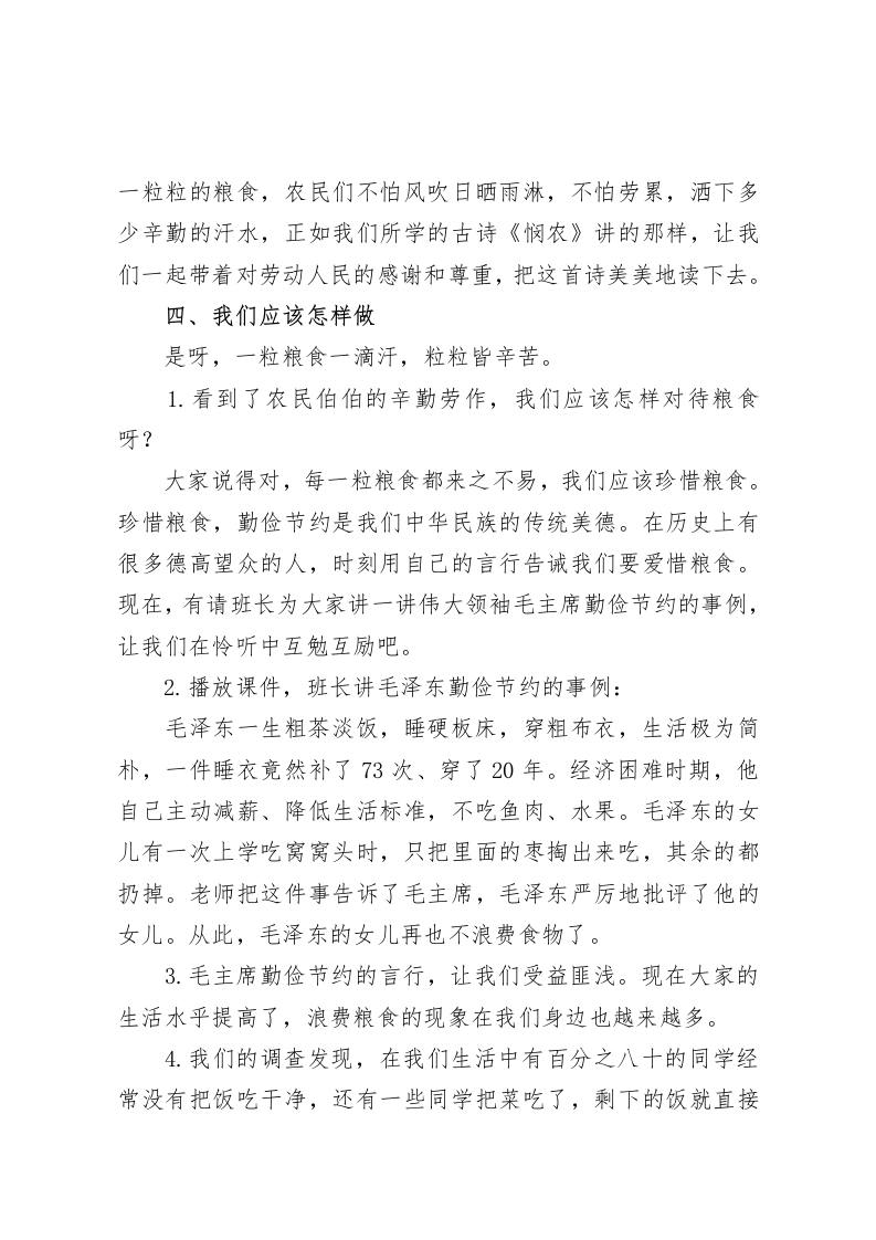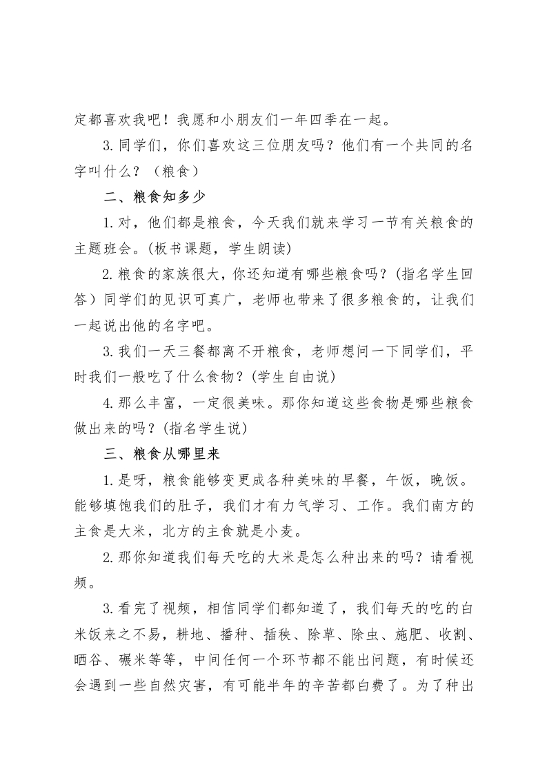 珍惜粮食,致敬耕耘2025年世界粮食日主题班会班会目标:1.了解勤俭节约是中华民族的传统美德,懂得勤俭节约的重要性。2.通过主题班会,使学生知道粮食的来之不易以及粮食的可贵,养成爱惜粮食、节约粮食的好习惯。3.懂得勤俭节约要从我做起,从现在做起,从平时的一点一滴做起。班会准备:多媒体课件班会过程:一、实物导入1.同学们,今天,我给大家带来几位好朋友,想不想见见他们?2.欢迎他们和大家见面,我们请这几位朋友给大家做一下自我介绍吧!水稻:我的名字叫水稻。小朋友们吃的白米饭是由我做成的。小麦:小朋友们,你们好,我是小麦,白白的馒头是用我做成的。玉米:我是胖胖的玉米,我的味道非常香甜。小朋友们一
