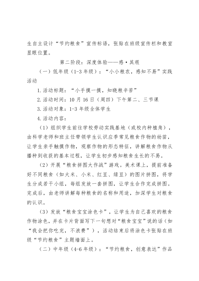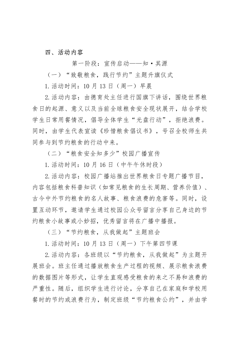 珍惜盘中餐,传承节俭风-2025年中小学世界粮食日活动方案“一粥一饭,当思来处不易;半丝半缕,恒念物力维艰。”粮食,是人类生存的根本,是社会稳定的基石。当前,全球粮食安全形势依然严峻,部分地区仍面临粮食短缺的问题,而在我们身边,浪费粮食的现象却时有发生。为深入贯彻落实XXXX书记关于制止餐饮浪费行为的重要指示精神,引导广大学生树立节约光荣、浪费可耻的意识,在10月16日世界粮食日来临之际,我校特制定本活动方案,旨在通过丰富多样的活动,让学生深刻认识粮食的重要性,养成勤俭节约的良好习惯。一、指导思想以XXXXXXXXX思想为指导,全面贯彻XXX的教育方针,落实立德树人根本任务。围绕2025年世界粮食日“手拉手共倡多样美食,聚合力同创美好未来”的核心主旨,将粮食安全教育融入学校德育工作,通过开展主题鲜明、形式多样的教育活动,培养学生的节约意识、责任意识和感恩意识,引导学生从自身做起,从点滴做起,共同营造珍惜粮食、反对浪费的良好校园氛围,助力构建节约型社会。二、活动主题珍惜‘食’光,不负‘粮’心三、活动对象我校1-9年级全体学生