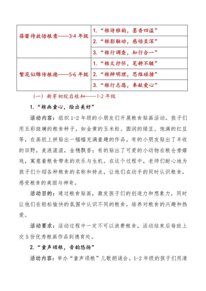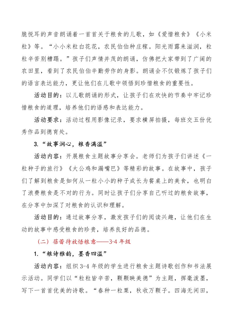 珍惜‘食’光,不负‘粮’心2025年世界粮食日学校活动方案“春种一粒栗,秋收万颗子。四海无闲田,农夫犹饿死。”李绅《悯农》“一粥一饭,当思来之不易;半丝半缕,恒念物力维艰。”朱柏庐《治家格言》2025年10月16日是第45个世界粮食日。为深入贯彻落实节约粮食精神,增强学生珍惜粮食、尊重劳动的意识,我校特制定本活动方案,通过一系列寓教于乐、知行合一的活动,引导学生在实践中感悟粮食的珍贵,在行动中传承节俭美德。一、活动主题珍惜‘食’光,不负‘粮’心二、活动时间2025年10月16日三、活动对象全体小学生四、活动安排活动年级活动内容1.“粮画童心,绘出美好”新芽初绽启粮知一1-2年级2.“童声颂粮,音韵悠扬”3.“故事润心,粮香满溢”