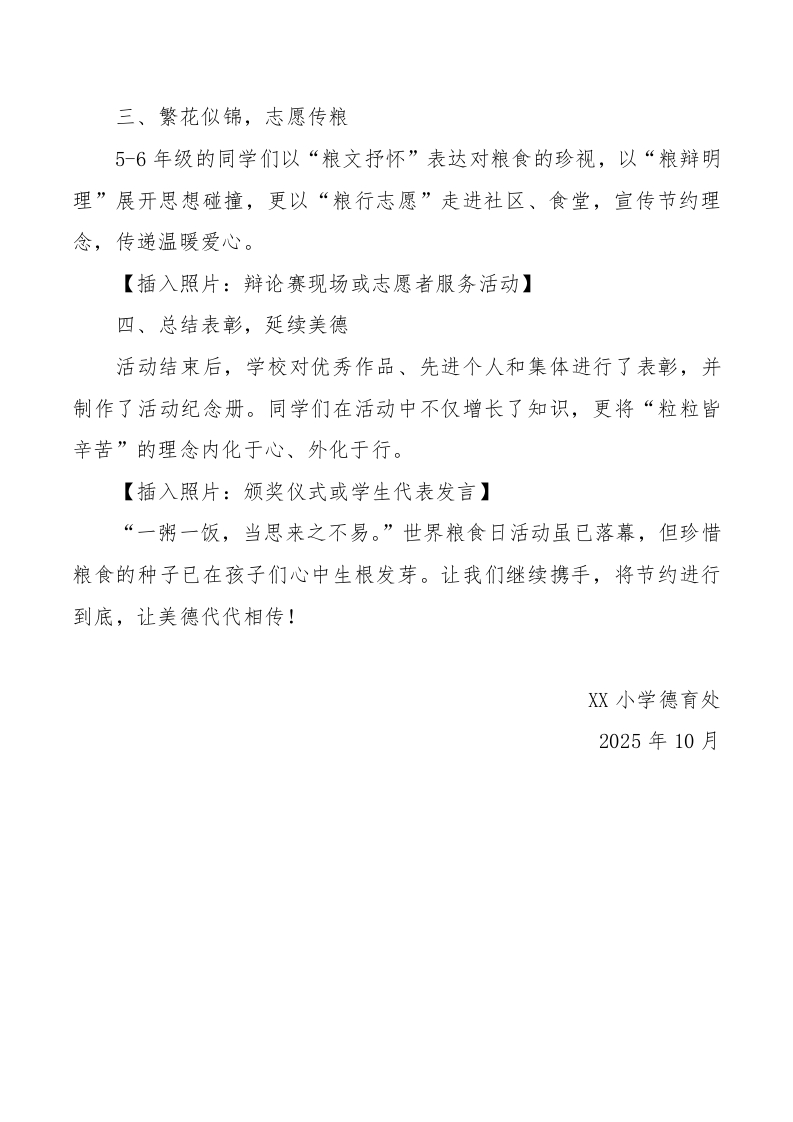 珍惜“食”光,不负“粮”心2025年世界粮食日主题活动圆满落幕金秋十月,稻谷飘香。在第45个世界粮食日来临之际,我校围绕“珍惜‘食’光,不负‘粮’心”主题,开展了一系列丰富多彩、富有教育意义的主题活动。全校学生积极参与,在实践体验中感悟粮食的珍贵,在潜移默化中传承节俭美德。【插入活动主图:全校活动启动仪式或各年级学生代表合影】一、新芽初绽,童趣识粮1-2年级的小朋友们在“粮画童心”活动中,用五谷杂粮拼贴出一幅幅充满想象力的画作,不仅认识了各类粮食,更在动手实践中体会到粮食的美丽与可贵。【插入照片:学生粮画作品展示或制作过程】“童声颂粮”儿歌朗诵会上,孩子们用稚嫩的嗓音传唱节约粮食的童谣,声声入耳,句句入心。【插入照片:学生朗诵儿歌现场】二、蓓蕾待放,知行悟粮3-4年级的同学在“粮诗雅韵”中挥毫泼墨,书写古诗新篇,传承文化经典;“粮影触动”环节,通过观看《袁隆平》等影片,深深被科学家精神所打动;“粮行调查”则让孩子们走进食堂、家庭,用数据说话,用行动发声。【插入照片:学生书法作品或观影讨论现场】