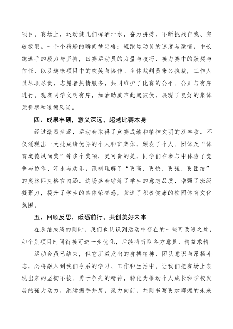 拼搏展风采,聚力向未来2025年学校秋季运动会总结稿金秋送爽,硕果盈枝。在全体师生的热情参与和共同努力下,以“金秋逐梦展风采,青春聚力向未来”为主题的2025年中小学秋季运动会已圆满落下帷幕。本届运动会不仅是一场体育竞技的盛会,更是一堂生动而深刻的素质教育实践课,全面展现了我校师生团结进取、奋发向上的精神风貌。一、组织周密,保障有力,奠定盛会坚实基础运动会的成功举办,得益于前期的精心策划与周密部署。学校成立了专项工作小组,明确了宣传、竞赛、后勤等各环节职责。从《开幕式实施方案》的精准执行,到竞赛项目的顺畅运转;从场地器材的提前布置,到医疗安保的全程护航,各部门通力协作,确保了整个活动组织有序、安全高效,为运动会的顺利举行奠定了坚实的基础。二、开幕式精彩纷呈,彰显青春昂扬风貌运动会的序幕在盛大而庄严的开幕式中拉开。国旗、校旗、会旗方阵庄重引领,各年级班级方阵步伐矫健、口号嘹亮、创意纷呈,充分展示了班级凝聚力与学子个性。校长及嘉宾的致辞鼓舞人心,运动员、裁判员的宣誓庄重严肃。特别是各年级带来的团体表演,从童真童趣的健身操到协调有力的团体操,动作整齐,活力四射,为全场观众奉献了一场精彩的视觉盛宴,将开幕式推向高潮。三、赛场竞争激烈有序,体育精神闪耀光芒本届运动会赛程紧凑,项目丰富,涵盖了田赛、径赛及趣味团体
