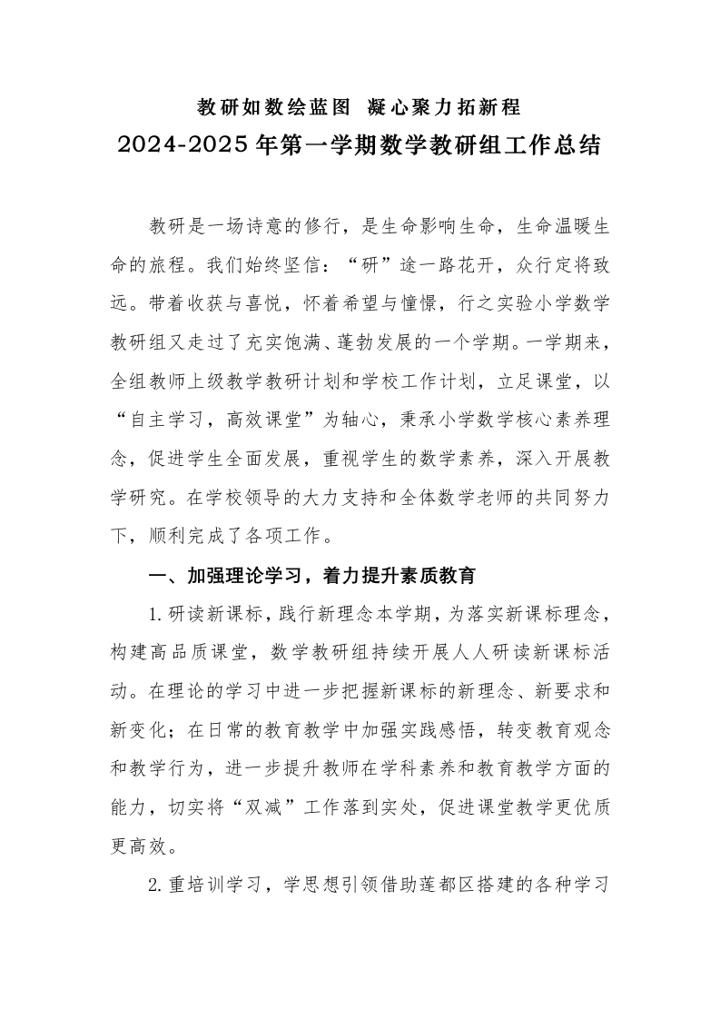 教研如数绘蓝图凝心聚力拓新程2024-2025年第一学期数学教研组工作总结教研是一场诗意的修行,是生命影响生命,生命温暖生命的旅程。我们始终坚信:“研”途一路花开,众行定将致远。带着收获与喜悦,怀着希望与憧憬,行之实验小学数学教研组又走过了充实饱满、蓬勃发展的一个学期。一学期来,全组教师上级教学教研计划和学校工作计划,立足课堂,以“自主学习,高效课堂”为轴心,秉承小学数学核心素养理念,促进学生全面发展,重视学生的数学素养,深入开展教学研究。在学校领导的大力支持和全体数学老师的共同努力下,顺利完成了各项工作。一、加强理论学习,着力提升素质教育1.研读新课标,践行新理念本学期,为落实新课标理念,构建高品质课堂,数学教研组持续开展人人研读新课标活动。在理论的学习中进一步把握新课标的新理念、新要求和新变化;在日常的教育教学中加强实践感悟,转变教育观念和教学行为,进一步提升教师在学科素养和教育教学方面的能力,切实将“双减”工作落到实处,促进课堂教学更优质更高效。2.重培训学习,学思想引领借助莲都区搭建的各种学习