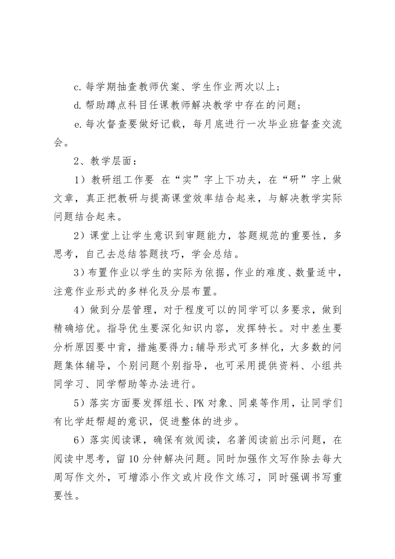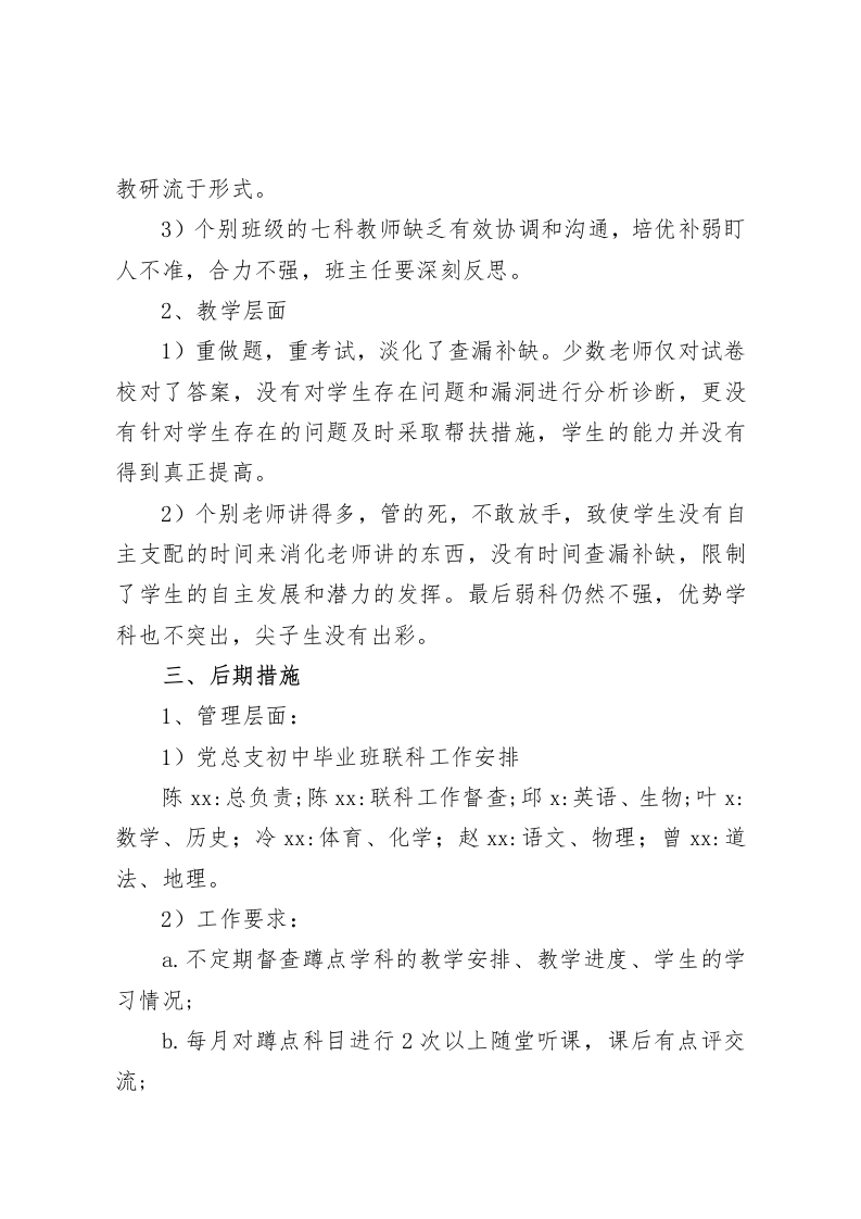 9月份月考总结质量分析会,校长讲话,讲了存在的问题,后期措施尊敬的老师们:大家中午好!开学4周来,在我们全体毕业科目老师的共同努力下,本届八、九年级的毕业班教育教学工作早入正轨,秩序井然。在此,谨代表中心学校向在座各位表示敬意和最诚挚的感谢!为了及时总结经验、查漏补缺,促进教育教学质量进一步提高,力争在2024年的中考中取得更加辉煌的成果,为顺利完成学校各项指标作好前期的准备。今天,我主要从9月份的考试情况出发,谈谈学校毕业科目教育教学方面的认识,不当之处还请各位批评指正。一、存在的主要问题1、拔尖是我们的短板,尖子生没有脱颖而出。各科优秀人数少:语文0、数学9/65、英语1/65、物理1/65、地理1/53、生物14/53。2、整体水平稍显落后,各科及格人数少:语文18/65、数学24/65、英语5/65、物理5/65、地理9/53、生物20/53。二、存在问题的反思1、管理层面1)虽有较为完善的制度和方案,但执行过程中有时碍于情面,对发现的问题不能及时大胆处理,影响了管理效果。2)个别教研组长的作用没有发挥出来,组内缺乏凝聚力,