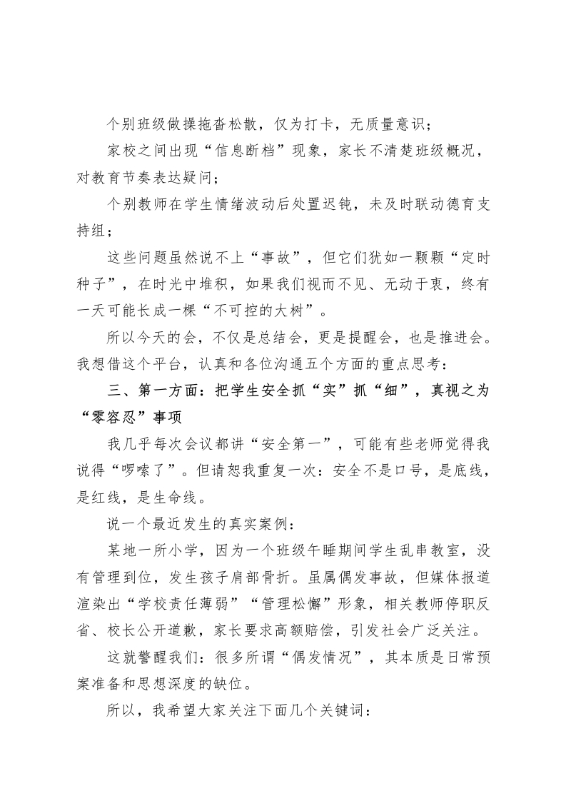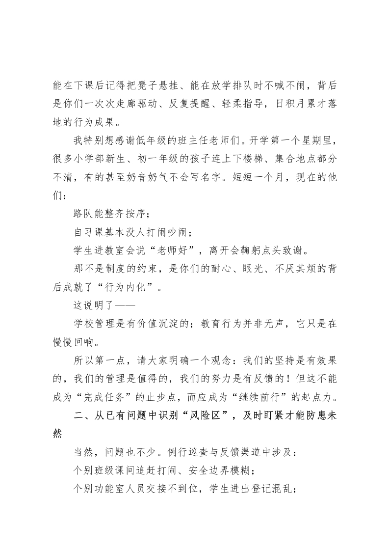 班主任工作例会校长讲话:细处着眼,实处用力,育人于心各位老师:大家好!国庆假期后,我们已经重新步入了紧张有序的教学节奏。今天把大家召集在一起,既是对过去一个多月时间工作的整体回顾,也是一次战术级的再推动。我们要围绕“安全、常规、班级文化、家校关系、教师状态”几个板块,既总结亮点,也照见问题,更强调行动。今天这场会,我们不回顾荣誉、不谈愿景,只聚焦一个问题一一学校真正想要的,是扎实推进,而不是短效应付;是全面落实,而不是虚化打点。我们开会的目的不止是布置任务,更是在组织一次集体“工作状态自查”。一、从正面画面里看到“努力的价值”:我们不是没有成效,而是需要理解成效背后,老师们默默的付出假期后,学校整体精神面貌较好:早操队伍安静高效;自习课堂书声朗朗;放学队列有序,教学楼内干净整洁,能看出许多班级细节管理已经较成熟。别小看这些“常态场景”,它的每一个“可复制”,都源自你们日复一日地坚持与行为对学生的持续影响力。一个孩子