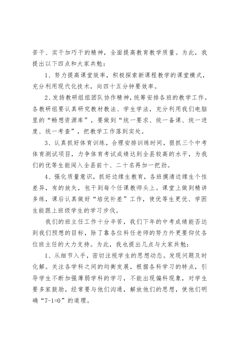初三教师会议,副校长讲话我们将不遗余力的做好自己的本职工作,不辜负学校领导对我们的重托和希望尊敬的X校长,尊敬的各位同仁:大家下午好!首先,请允许我代表初三年级全体师生,对xx校长于百忙之中,亲临我们初三年级指导工作,表示衷心的感谢。上一届初三,在校领导班子的正确领导下,通过全体教师的共同努力,取得了相当的成绩,这对我们这一届的初三来讲,既是动力,更是压力,从上学期期末考试成绩来看,我们部分学科虽有优势但不明显,部分学科尚有差距,总体优势与去年相比不算太小。因此,如何保持去年的中考成绩,下一年取得更好的成绩,这对于我们来说,将是一场艰巨的任务和严峻的考验。为此,我作为初三年级领导小组的办公室主任,今天在这里首先表示一下我个人的态度:xx校长亲自指导初三年级工作,这充分说明xx校长对初三工作的重视和关爱,为了不辜负校长的期望,我将以身作则,下周我就搬到初三年级办公室去办公,和大家同甘苦、共患难,群策群力,及时发现问题,及时解决问题,坚决做好大家的服务兵,和大家一起奋力拼搏,全面搞好初三年级的各项工作。本届初三现有学生335人,整体水平参差不齐,特别是各班发展也不均衡。为此,我们只有扎实工作,花大力气,发扬