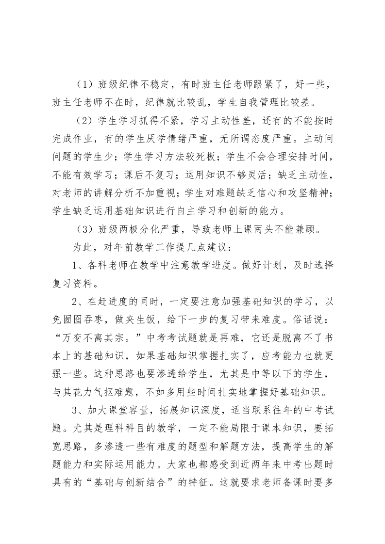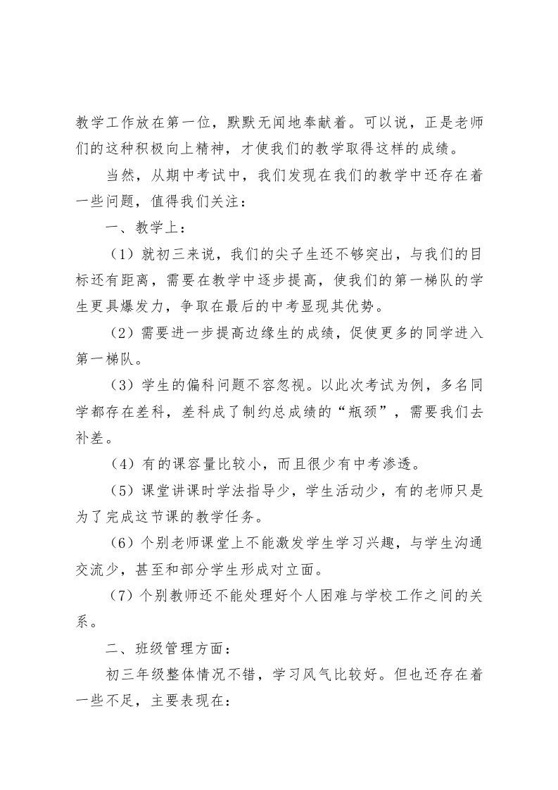 初三期中考试质量分析会,副校长在九年级教师会上发言这次期中考试从成绩看比上学期有进步,这要归功于全体老师老师们:转眼间半个学期已过去,期中考试也于一周前顺利结束。在整个考试过程中,秩序井然,纪律严明,组织严密,考试结果真实,较好的反应了我校这届初三的真实水平和现状。这次期中考试从成绩看比上学期有进步,这要归功于全体老师。感谢你们的努力和付出,也感谢你们对初三年级工作的支持。今天,召开期中考试质量分析会:一是对上半学期工作的一个小结,二也是对下半学期工作的一个研讨。我们举行期中总结会,就是要让我们的老师看到前一段的成绩,以便于总结得失,使后一阶段的教学工作再上新台阶。对于前段时间教学工作取得一些成绩的原因,我主要谈两个感谢:感谢以孙校长为首的学校领导对初三年级的大力支持。在班主任和任课老师的选择上首先考虑初三,在劳动卫生方面优待初三,在后勤服务方面优先考虑初三。第二要感谢全体初三老师。从开学到现在,我们全体初三老师本着对事业的责任心、对同学们的负责,在教育的道路上勤勤恳恳、兢兢业业,辛勤付出。张Xx老师虽年龄最长,除了教学外,还担任着班主任;Xx主任,身兼多职,多头忙活;Xx、xx一边搞教学,一边忙孩子;Xx也是跨年级上课。还有其他老师排除各种干扰,把
