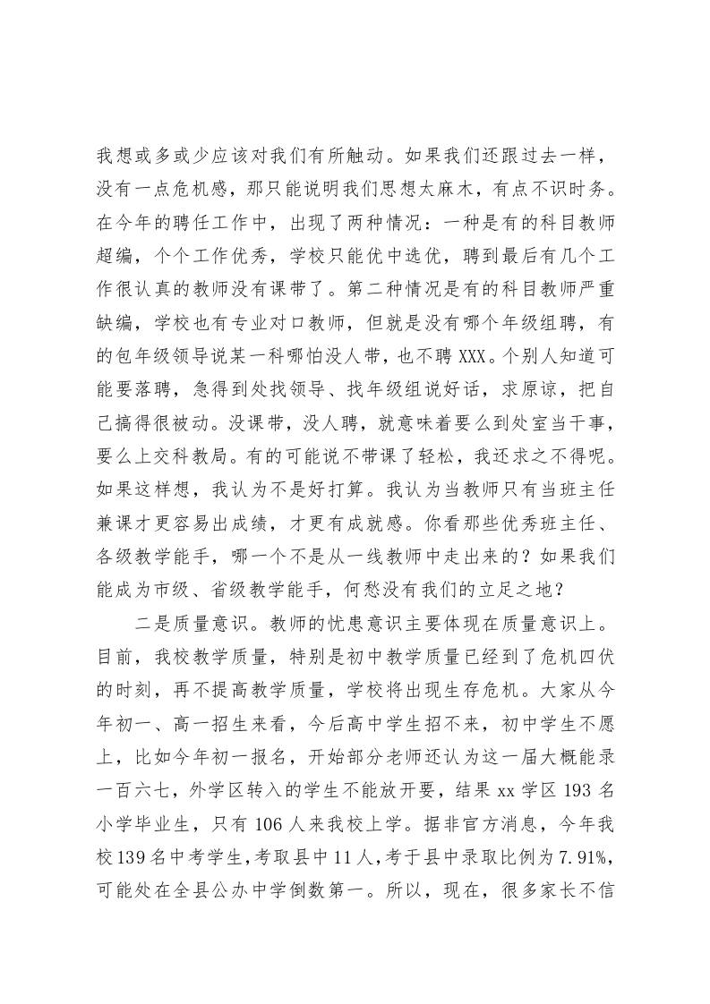 初一年级教师大会,校长讲话谈今后工作设想和打算,二是对年级组工作提几点建议和要求老师们:大家辛苦了。我代表个人和年级组对大家表示热烈的欢迎!今晚的会议内容主要有两项:一是请年级组长Xxx简单汇报一下初一年级组的基本情况,谈谈今后工作设想和打算。二是我对年级组工作提几点建议和要求。首先,请吴Xx汇报初一年级组基本情况,谈谈今后工作设想和打算。刚才Xxx老师就初一年级组基本情况向大家做了简要汇报,对年级组今后工作提出了很好的设想与打算,我完全赞成,希望大家在今后工作中遵照执行。借此机会,我谈五点建议和要求。我的建议和要求可以概括为“一二三四五”,即明确一个目标,树立两种意识,发扬三种精神,落实四个到位,做到五个禁止。1、明确一个目标。这个目标就是七年级今后在全县各类考试中必须摔掉倒数后五位。2、树立两种意识。一是忧患意识。人无远虑必有近忧。通过今年的教师选聘,