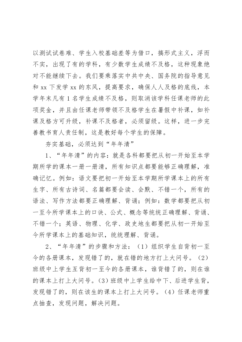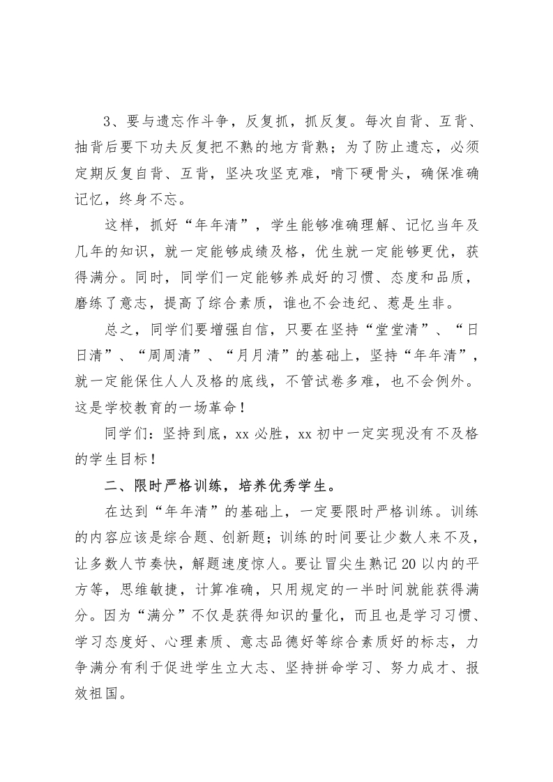 初中初一、初二月考质量分析会上,校长讲话解决存在问题,补上短板,提高质量、再上台阶亲爱的同学们:我们xx学校成为名校,我们的同学在xx能够接受优质教育,大有希望,我们xx教师能够成为名师、名校长。我们爱xx,我们自信,我们自豪!今年X月Xx市教体局下发了向xx学校学习的文件,全市继续掀起全面学习Xx学校、面向全体学生、教好每名学生的新热潮,这给我们学校极大的鼓舞、鞭策和力量。全市学xx,Xx怎么办?我们Xx师生一定要在成绩面前,抢时间、抓机遇,加大力度,反对形式主义,解决存在问题,补上短板,提高质量、再上台阶,不折不扣地实现本学期的奋斗目标。本学期的奋斗目标是什么呢?一、坚决夯实基础,确保无一成绩不及格。中共中央、国务院深化义务教育改革的文件中要求“面向全体学生,教好每名学生”,这是党交给我们的历史使命,也是我们坚定“没有教不好的学生”的教育理念,教好每位学生的底线,如有一名学生成绩不及格,就是达不到教好每个学生的底线,就是没有完成好历史使命。近几年,我校小学部学生人人优秀,而初中部却有人动摇“没有教不好的学生”的理念,