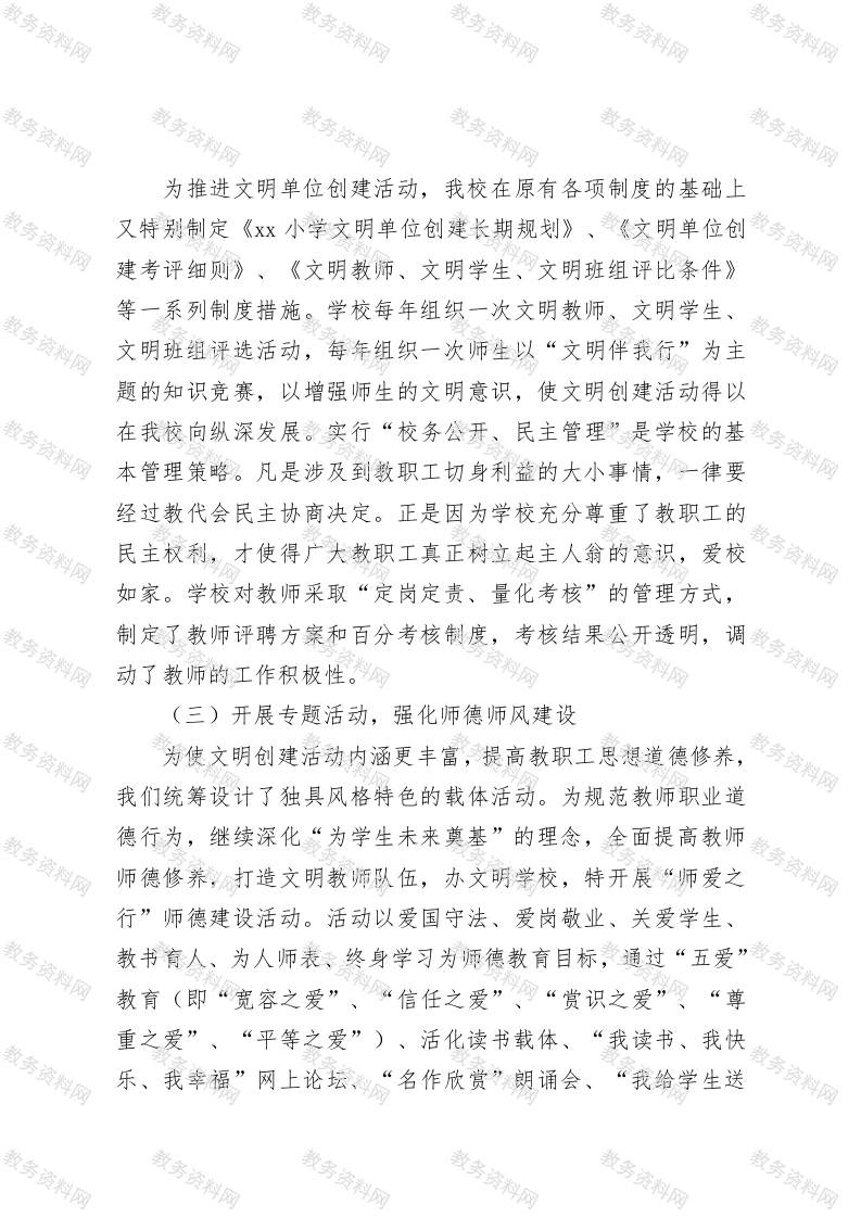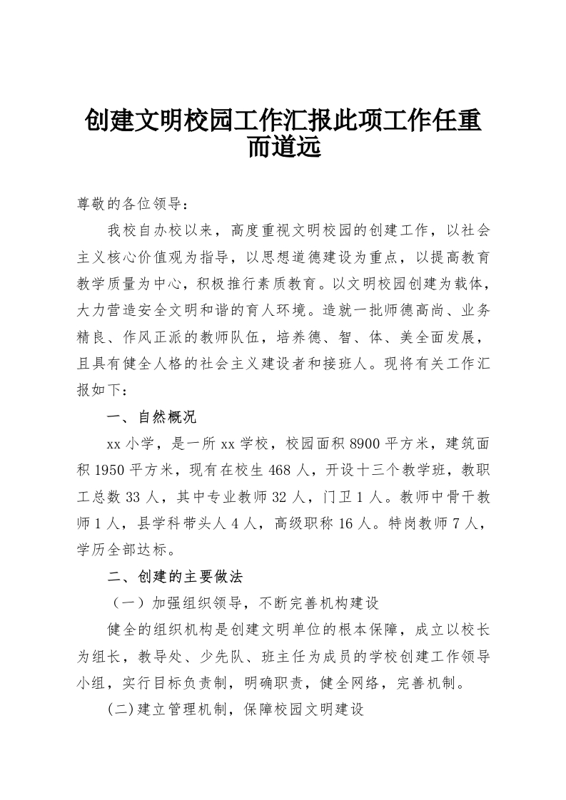 创建文明校园工作汇报此项工作任重而道远尊敬的各位领导:我校自办校以来,高度重视文明校园的创建工作,以社会主义核心价值观为指导,以思想道德建设为重点,以提高教育教学质量为中心,积极推行素质教育。以文明校园创建为载体,大力营造安全文明和谐的育人环境。造就一批师德高尚、业务精良、作风正派的教师队伍,培养德、智、体、美全面发展,且具有健全人格的社会主义建设者和接班人。现将有关工作汇报如下:一、自然概况xx小学,是一所xx学校,校园面积8900平方米,建筑面积1950平方米,现有在校生468人,开设十三个教学班,教职工总数33人,其中专业教师32人,门卫1人。教师中骨干教师1人,县学科带头人4人,高级职称16人。特岗教师7人,学历全部达标。二、创建的主要做法(一)加强组织领导,不断完善机构建设健全的组织机构是创建文明单位的根本保障,成立以校长为组长,教导处、少先队、班主任为成员的学校创建工作领导小组,实行目标负责制,明确职责,健全网络,完善机制。(二)建立管理机制,保障校园文明建设
