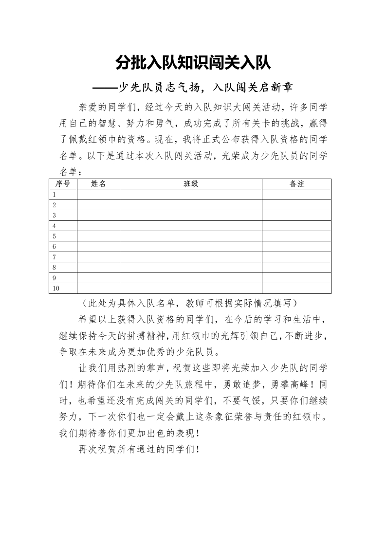 分批入队知识闯关入队一少先队员志气扬,入队闯关启新章亲爱的同学们,经过今天的入队知识大闯关活动,许多同学用自己的智慧、努力和勇气,成功完成了所有关卡的挑战,赢得了佩戴红领巾的资格。现在,我将正式公布获得入队资格的同学名单。以下是通过本次入队闯关活动,光荣成为少先队员的同学名单:序号姓名班级备注12345678910(此处为具体入队名单,教师可根据实际情况填写)希望以上获得入队资格的同学们,在今后的学习和生活中,继续保持今天的拼搏精神,用红领巾的光辉引领自己,不断进步,争取在未来成为更加优秀的少先队员。让我们用热烈的掌声,祝贺这些即将光荣加入少先队的同学们!期待你们在未来的少先队旅程中,勇敢追梦,勇攀高峰!同时,也希望还没有完成闯关的同学们,不要气馁,只要你们继续努力,下一次你们也一定会戴上这条象征荣誉与责任的红领巾。我们期待着你们更加出色的表现!再次祝贺所有通过的同学们!