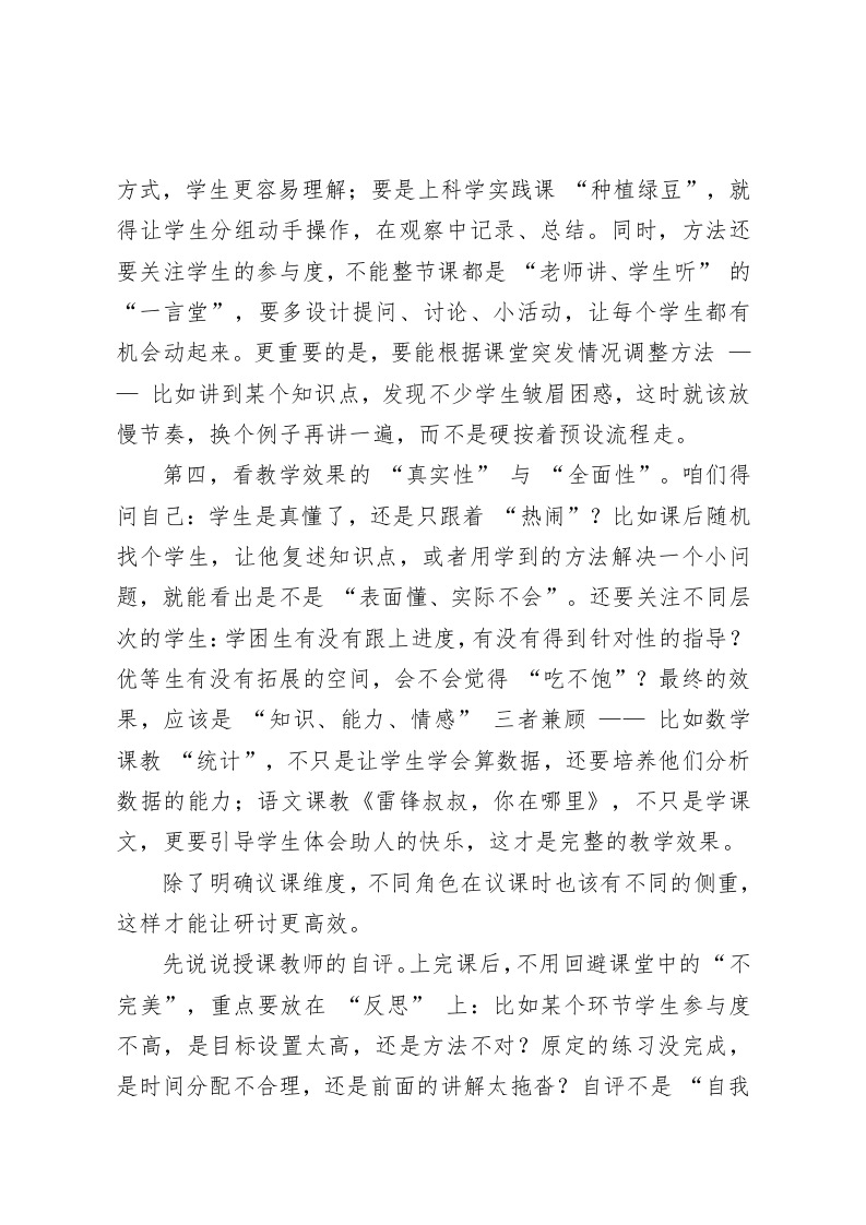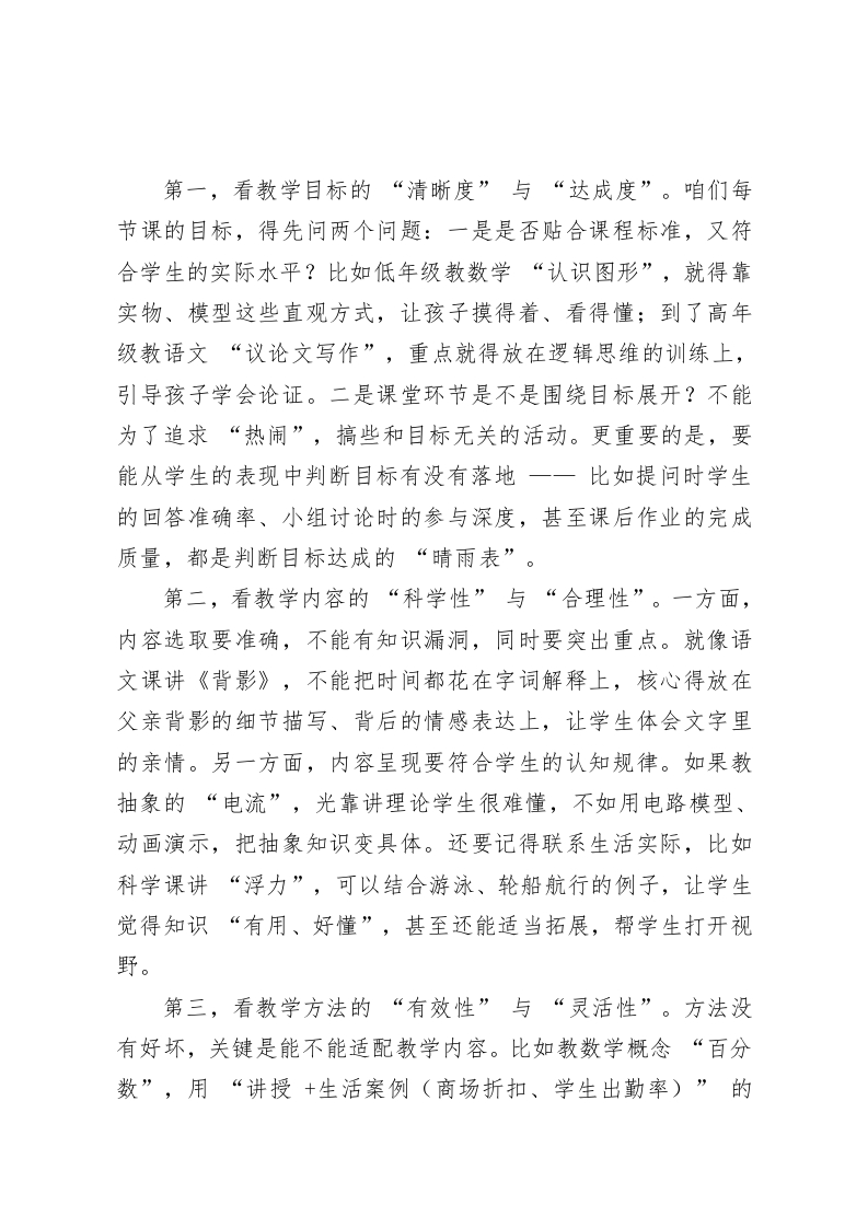 教学副校长在全体教师大会讲话:以观课议课促教学反思,以专业研讨助师生成长各位同仁:上午好!今天想和大家聊一个咱们教学工作中常遇到的话题听课评课。相信不少老师都有过这样的经历:听完一节课后,拿着记录的教学流程,评课时大家各抒己见,有时会不自觉陷入“挑毛病、评对错”的误区,原本该是专业研讨的场合,反而多了些紧张感,少了些彼此扶持的温度,甚至偶尔会让授课老师觉得像是在“接受批评”。其实,咱们不妨换个思路:把“听课评课”换成“观课议课”,会不会更贴合咱们的教学初心?“观课议课”不是找问题、定优劣,而是咱们全体教师抱团成长的契机。这里的“观”,是带着研究的眼光看课堂;“议”,是抱着平等的心态聊教学。它的核心不是评价某一节课好与坏,而是通过共同观察课堂细节、讨论教学环节,一起发现教学中可能存在的困惑,琢磨怎么能让咱们的课教得更实、更活,最终帮助每个人在反思中提升,让课堂真正受益于学生。说到议课,这既是对咱们专业能力的考验,也是对彼此沟通智慧的体现。要让议课有价值,首先得明确议课的核心维度,避免凭主观感受下判断。接下来,我就从“教”与“学”两个视角,和大家聊聊议课该聚焦哪些关键方向。
