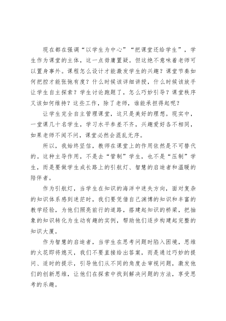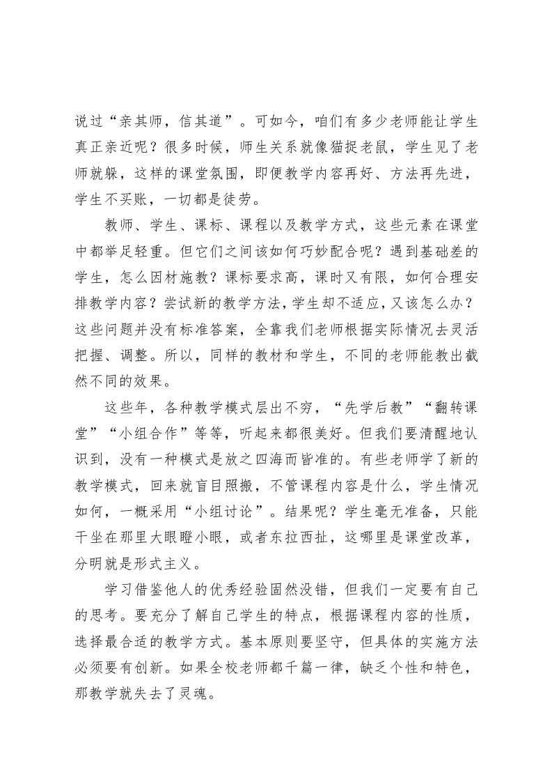 提升课堂教学质量校长讲话:这些真话,我不吐不快各位老师:今天,我想和大家坦诚地聊一聊课堂教学中那些值得我们深思的问题。咱们先聊聊课堂上的那些“怪现象”。上课的时候,大家肯定都遇到过学生玩手机、睡觉或者发呆的情况。看到这些,咱们先别急着抱怨现在的学生难教。不妨先问问自己,我们的课堂,有没有问题?我最近听了不少课,真是感触颇深。有的老师,整堂课就像在唱“独角戏”,从上课铃响讲到下课铃响,45分钟全程自己“表演”,学生连发言的机会都没有。下课铃一响,学生就像被释放的小鸟,迫不及待地往外冲。这样的课堂,缺乏互动,没有活力,怎么能吸引学生呢?还有一些课堂,看似模式“先进”,导入、自学、讨论、展示、总结,环节一个不少。但仔细观察,学生讨论的内容往往和课堂主题无关,要么是昨天的趣事,要么就是随意闲聊。更有甚者,有些老师眼里只有考试,“这个要考,记下来”“这个不考,不用管”,把课堂变成了枯燥的考点罗列。这样的教学,怎么能激发学生的学习兴趣呢?那课堂教学,究竟是在做什么呢?我认为,课堂的核心在于处理各种关系。师生关系尤为关键,孔子早在两千多年前就