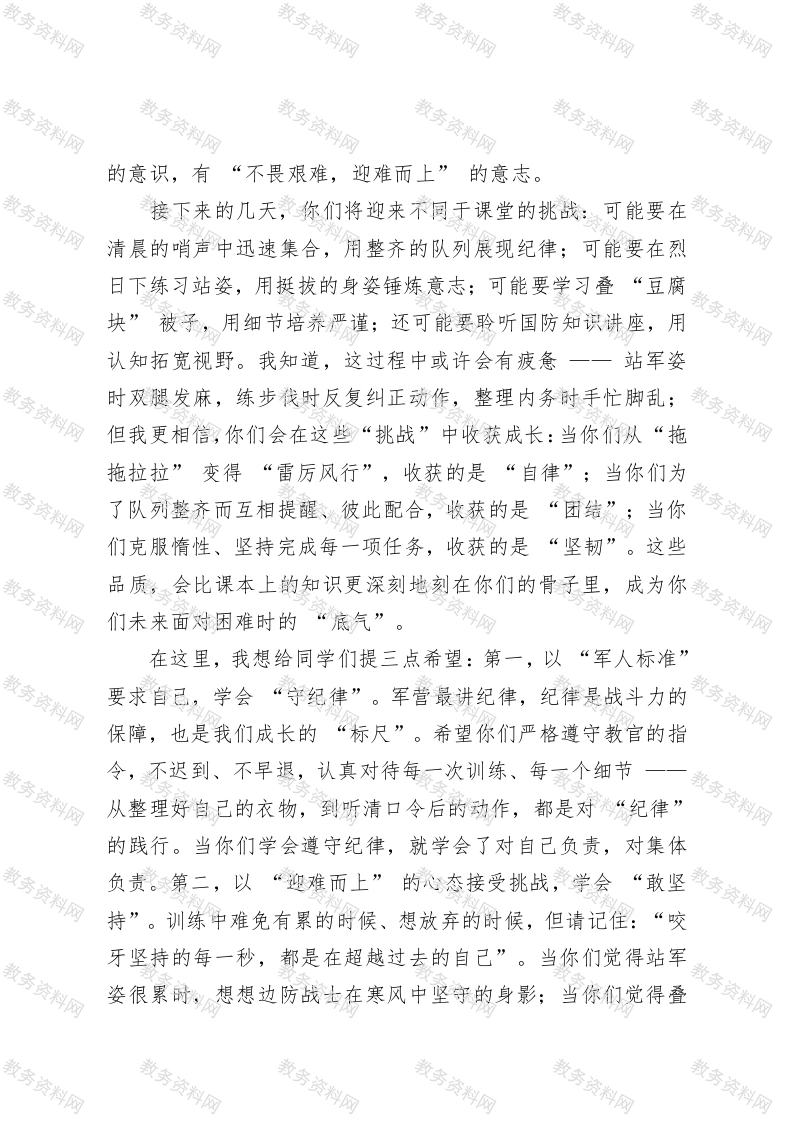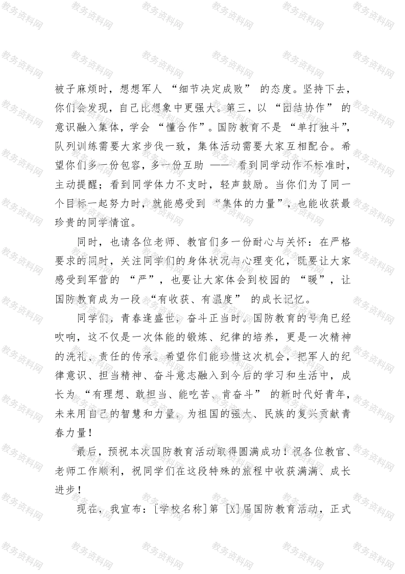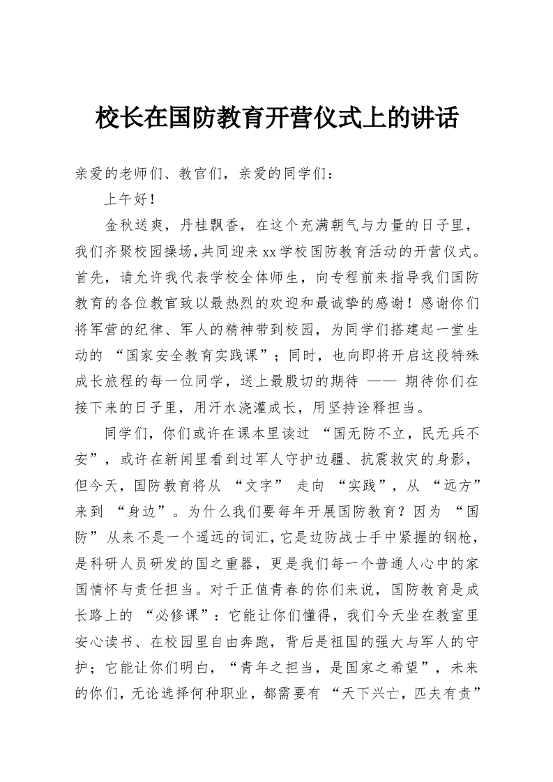 校长在国防教育开营仪式上的讲话亲爱的老师们、教官们,亲爱的同学们:上午好!金秋送爽,丹桂飘香,在这个充满朝气与力量的日子里,我们齐聚校园操场,共同迎来xx学校国防教育活动的开营仪式。首先,请允许我代表学校全体师生,向专程前来指导我们国防教育的各位教官致以最热烈的欢迎和最诚挚的感谢!感谢你们将军营的纪律、军人的精神带到校园,为同学们搭建起一堂生动的“国家安全教育实践课”;同时,也向即将开启这段特殊成长旅程的每一位同学,送上最殷切的期待一一期待你们在接下来的日子里,用汗水浇灌成长,用坚持诠释担当。同学们,你们或许在课本里读过“国无防不立,民无兵不安”,或许在新闻里看到过军人守护边疆、抗震救灾的身影,但今天,国防教育将从“文字”走向“实践”,从“远方”来到“身边”。为什么我们要每年开展国防教育?因为“国防”从来不是一个遥远的词汇,它是边防战士手中紧握的钢枪,是科研人员研发的国之重器,更是我们每一个普通人心中的家国情怀与责任担当。对于正值青春的你们来说,国防教育是成长路上的“必修课”:它能让你们懂得,我们今天坐在教室里安心读书、在校园里自由奔跑,背后是祖国的强大与军人的守护;它能让你们明白,“青年之担当,是国家之希望”,未来的你们,无论选择何种职业,都需要有“天下兴亡,匹夫有责”