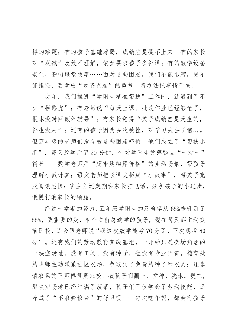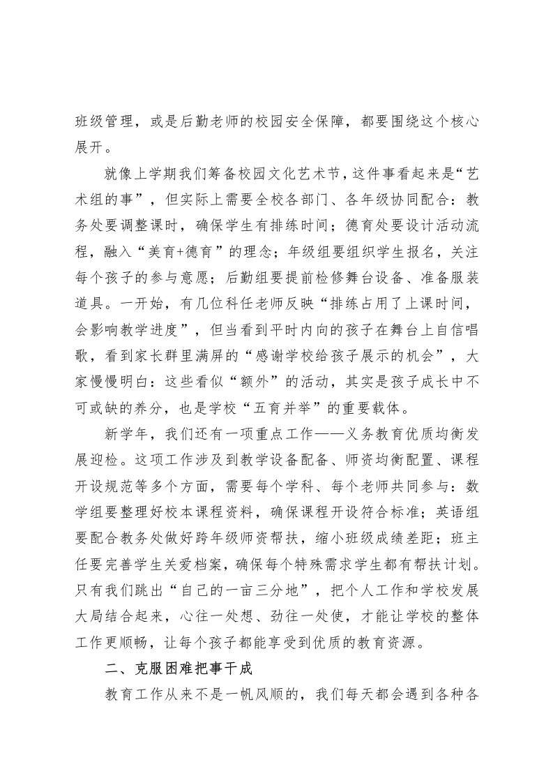 新学年全体教师大会,校长讲话:以六个“干”字笃行教育使命,共护学生全面成长尊敬的各位老师:大家上午好!金秋九月,带着对暑假的余韵,更带着对新学年的期盼,我们又一次齐聚在这间会议室,共同开启学校发展的新征程。过去一学年,在全体教职工的并肩奋斗下,我们在教学质量提升、德育品牌打造、课后服务创新等方面都交出了不错的答卷一一六年级毕业统考优秀率较去年提高8%,“非遗进校园”活动获评区级特色德育案例,课后服务参与率达到95%以上。这些成绩的背后,是每一位老师早出晚归的坚守,是批改作业到深夜的执着,更是面对学生困惑时耐心引导的责任。新学年,教育政策在持续优化,“双减”要向纵深推进,“五育并举”要落到课堂细节,义务教育优质均衡发展迎检工作也进入关键阶段。面对这些新任务、新挑战,我想和大家围绕六个“干”字,聊聊新学年的工作方向,希望我们能一起把学校的事、孩子们的事干得更实、更好、更精。一、顾全大局把事干好古人说“不谋全局者,不足以谋一域”。对我们学校而言,“全局”就是“让每个孩子全面发展、健康成长”,我们每一位老师的工作一一无论是语文课堂的字词教学,还是班主任的