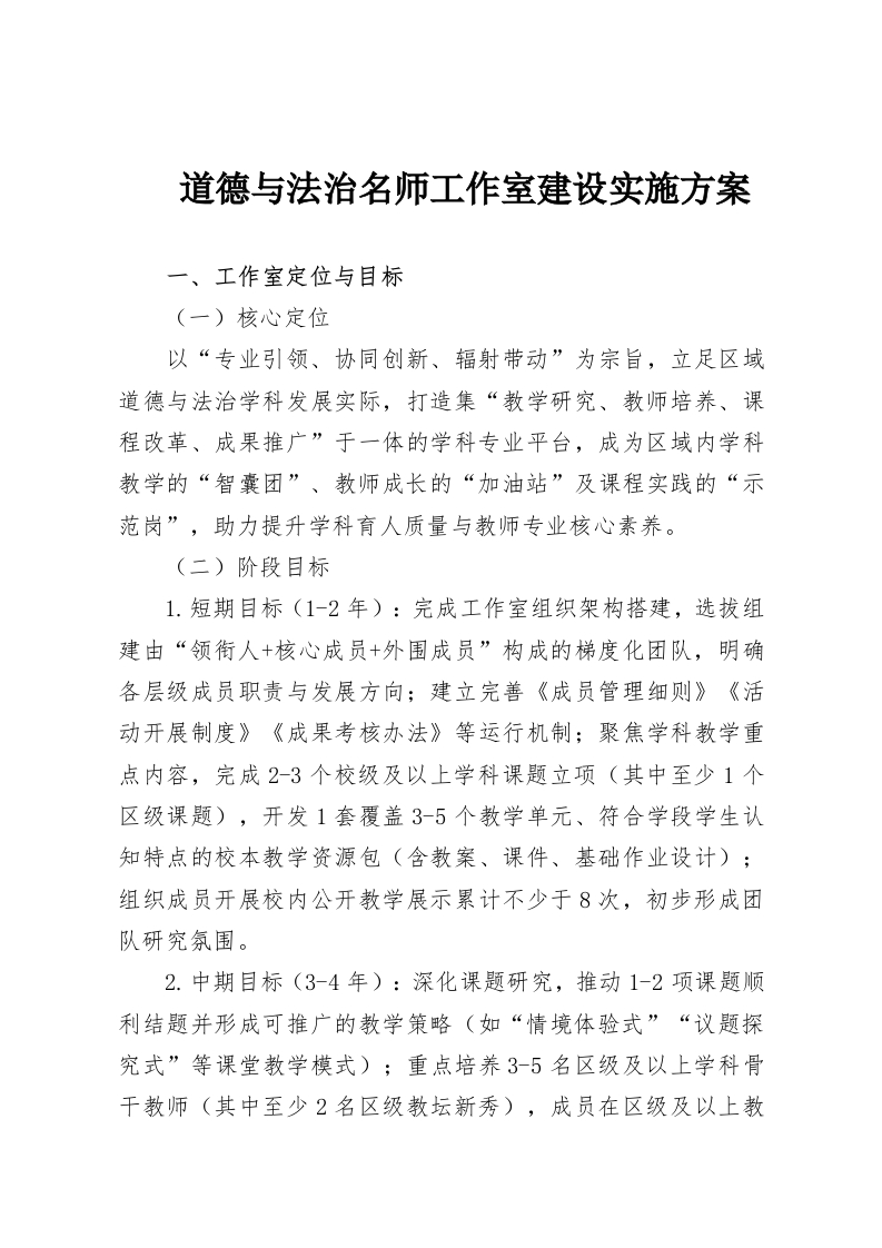 道德与法治名师工作室建设实施方案一、工作室定位与目标(一)核心定位以“专业引领、协同创新、辐射带动”为宗旨,立足区域道德与法治学科发展实际,打造集“教学研究、教师培养、课程改革、成果推广”于一体的学科专业平台,成为区域内学科教学的“智囊团”、教师成长的“加油站”及课程实践的“示范岗”,助力提升学科育人质量与教师专业核心素养。(二)阶段目标1.短期目标(1-2年):完成工作室组织架构搭建,选拔组建由“领衔人+核心成员+外围成员”构成的梯度化团队,明确各层级成员职责与发展方向;建立完善《成员管理细则》《活动开展制度》《成果考核办法》等运行机制;聚焦学科教学重点内容,完成2-3个校级及以上学科课题立项(其中至少1个区级课题),开发1套覆盖3-5个教学单元、符合学段学生认知特点的校本教学资源包(含教案、课件、基础作业设计);组织成员开展校内公开教学展示累计不少于8次,初步形成团队研究氛围。2.中期目标(3-4年):深化课题研究,推动1-2项课题顺利结题并形成可推广的教学策略(如“情境体验式”“议题探究式”等课堂教学模式);重点培养3-5名区级及以上学科骨干教师(其中至少2名区级教坛新秀),成员在区级及以上教