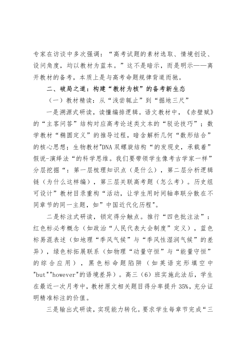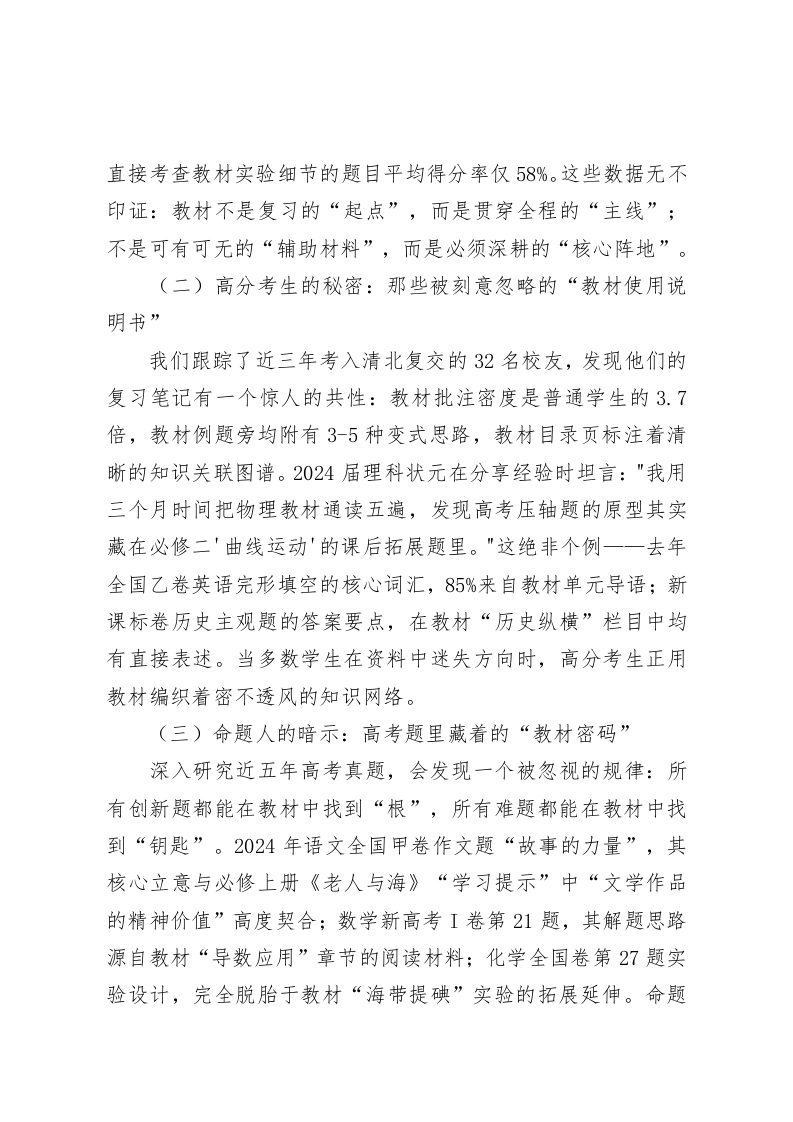 高三毕业班教师会上,副校长讲话:被低估的教材力量一一为何高分考生总在回归,而多数人仍在迷途?各位同仁:大家上午好!今天我们站在高考冲刺的关键节点,共同探讨一个被反复提及却始终未被真正重视的命题一一当无数考生埋首于书山题海时,为何那些顶尖学子总能拨开迷雾,坚守教材这片“根据地”?当各类复习资料层出不穷时,为何高考命题人始终将教材视为命题的“源头活水”?今天,我将围绕“回归教材”这一核心,从认知觉醒、实践路径、协同保障三个维度,与大家共同破解备考中的“舍本逐末”之困。一、迷途与正道:重新审视教材的战略价值(一)被误读的教材:从“基础载体”到“提分利器”的认知跃迁长期以来,教材在备考中遭遇三重误读:一是认为“教材太简单,配不上高考难度”,二是觉得“教材内容都懂,无需反复研读”,三是主张“资料比教材系统,复习效率更高”。这三种认知如同无形的枷锁,让我们在备考路上越走越偏。2024年高考成绩分析显示,我校考生基础题失分率高达32%,其中90%的错误集中在教材原文表述的理解偏差一一数学“充分必要条件”的定义混淆,源于教材黑体字未吃透;语文古诗文默写错别字率居高不下,只因对教材注释的忽视;理综选择题中,