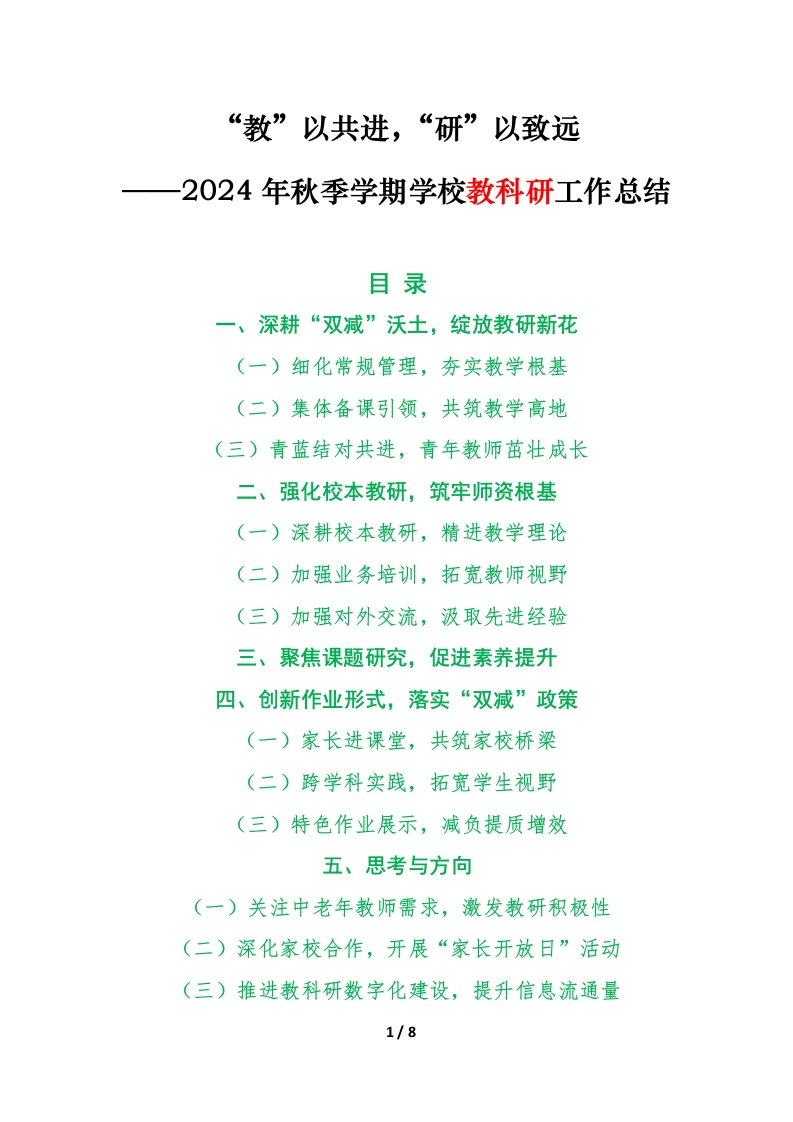 “教”以共进,“研”以致远2024年秋季学期学校教科研工作总结目录一、深耕“双减”沃土,绽放教研新花(一)细化常规管理,夯实教学根基(二)集体备课引领,共筑教学高地(三)青蓝结对共进,青年教师茁壮成长二、强化校本教研,筑牢师资根基(一)深耕校本教研,精进教学理论(二)加强业务培训,拓宽教师视野(三)加强对外交流,汲取先进经验三、聚焦课题研究,促进素养提升四、创新作业形式,落实“双减”政策(一)家长进课堂,共筑家校桥梁(二)跨学科实践,拓宽学生视野(三)特色作业展示,减负提质增效五、思考与方向(一)关注中老年教师需求,激发教研积极性(二)深化家校合作,开展“家长开放日”活动(三)推进教科研数字化建设,提升信息流通量1/8