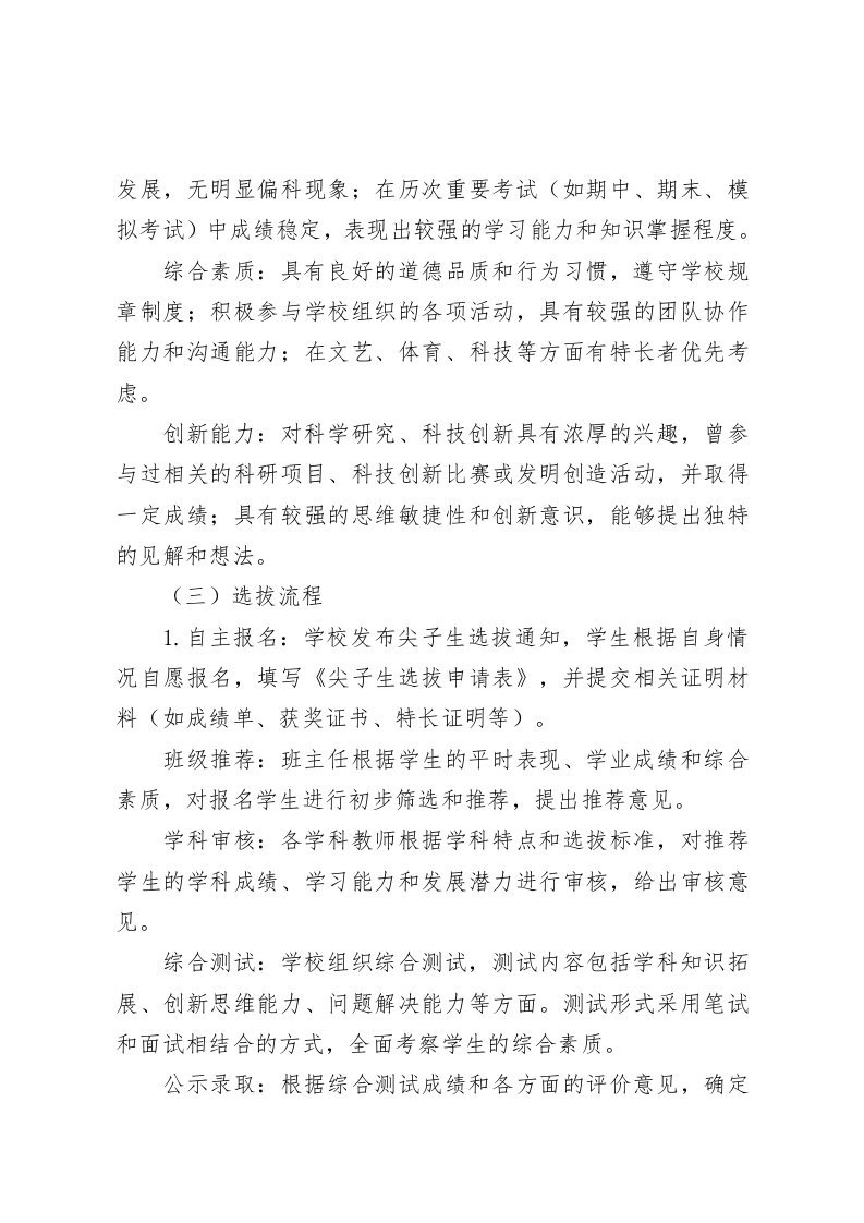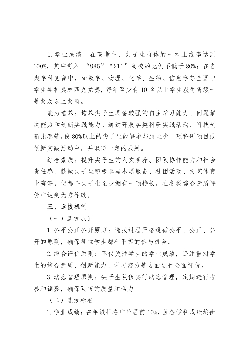 高中尖子生全链条培养与精细化管理实施方案(2025修订版)一、现状分析在当前高中教育体系中,尖子生作为学校学术声誉和教学质量的重要体现,其培养管理工作面临着诸多机遇与挑战。从整体情况来看,学校在尖子生培养方面已具备一定的基础,拥有一批教学经验丰富的教师和较为完善的教学设施,但同时也存在一些亟待解决的问题。部分教师在教学过程中,仍采用传统的“一刀切”教学模式,未能充分关注尖子生的个性化学习需求,导致尖子生的学习潜力难以得到充分挖掘。在课程设置上,缺乏针对尖子生的特色课程和拓展性课程,无法满足尖子生对知识深度和广度的追求。此外,学校在尖子生的选拔、跟踪管理以及心理辅导等方面的机制还不够健全,难以对尖子生进行全方位、系统性的培养。二、方案目标(一)总体目标通过科学、系统的培养管理措施,全面提升尖子生的综合素质,培养一批具有扎实的学科基础、较强的创新思维能力、良好的人文素养和国际视野的优秀学生,为国内外知名高校输送高质量的生源,同时提高学校的教育教学质量和社会声誉。(二)具体目标