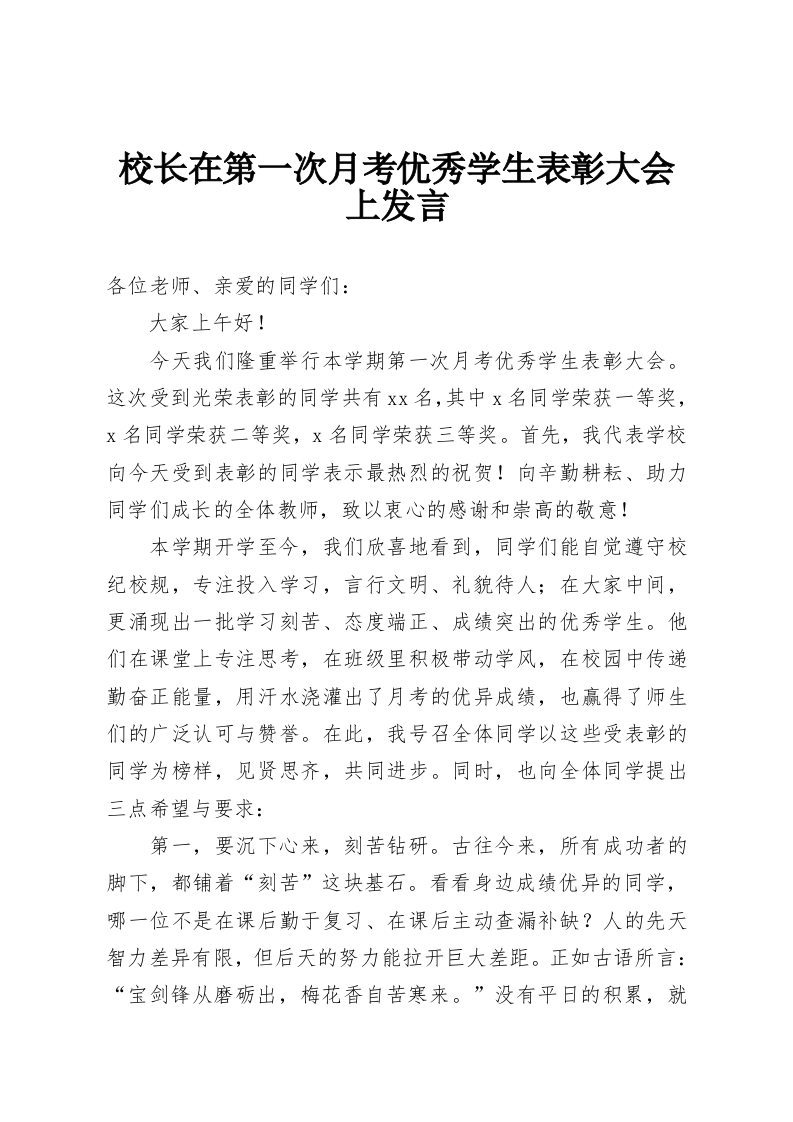 校长在第一次月考优秀学生表彰大会上发言各位老师、亲爱的同学们:大家上午好!今天我们隆重举行本学期第一次月考优秀学生表彰大会。这次受到光荣表彰的同学共有xx名,其中x名同学荣获一等奖,x名同学荣获二等奖,x名同学荣获三等奖。首先,我代表学校向今天受到表彰的同学表示最热烈的祝贺!向辛勤耕耘、助力同学们成长的全体教师,致以衷心的感谢和崇高的敬意!本学期开学至今,我们欣喜地看到,同学们能自觉遵守校纪校规,专注投入学习,言行文明、礼貌待人;在大家中间,更涌现出一批学习刻苦、态度端正、成绩突出的优秀学生。他们在课堂上专注思考,在班级里积极带动学风,在校园中传递勤奋正能量,用汗水浇灌出了月考的优异成绩,也赢得了师生们的广泛认可与赞誉。在此,我号召全体同学以这些受表彰的同学为榜样,见贤思齐,共同进步。同时,也向全体同学提出三点希望与要求:第一,要沉下心来,刻苦钻研。古往今来,所有成功者的脚下,都铺着“刻苦”这块基石。看看身边成绩优异的同学,哪一位不是在课后勤于复习、在课后主动查漏补缺?人的先天智力差异有限,但后天的努力能拉开巨大差距。正如古语所言:“宝剑锋从磨砺出,梅花香自苦寒来。”没有平日的积累,就