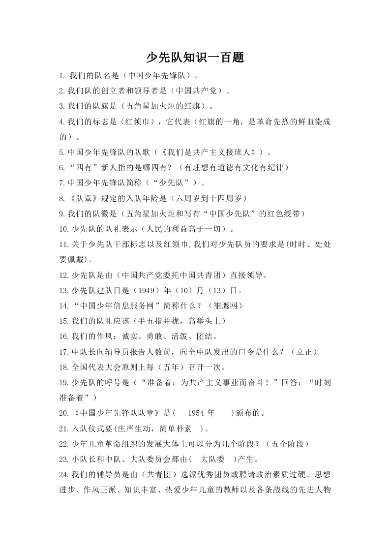 少先队知识一百题1.我们的队名是(中国少年先锋队)。2.我们队的创立者和领导者是(中国共产党)。3.我们的队旗是(五角星加火炬的红旗)。4.我们的标志是(红领巾),它代表(红旗的一角,是革命先烈的鲜血染成的)。5.中国少年先锋队的队歌(《我们是共产主义接班人》)。6.“四有”新人指的是哪四有?(有理想有道德有文化有纪律)7.中国少年先锋队简称(“少先队”)。8.《队章》规定的入队年龄是(六周岁到十四周岁)9.我们的队徽是(五角星加火炬和写有“中国少先队”的红色绶带)10.少先队的队礼表示(人民的利益高于一切)。11.关于少先队干部标志以及红领巾,我们对少先队员的要求是(时时、处处要佩戴)。12.少先队是由(中国共产党委托中国共青团)直接领导。13.少先队建队日是(1949)年(10)月(13)日。14.“中国少年信息服务网”简称什么?(雏鹰网)15.我们的队礼应该(手五指并拢,高举头上)16.我们的作风:诚实、勇敢、活泼、团结。17.中队长向辅导员报告人数前,向全中队发出的口令是什么?(立正)18.全国代表大会原则上每(五年)召开一次。19.少先队的呼号是(“准备着:为共产主义事业而奋斗!”回答:“时刻准备着”)20.《中国少年先锋队队章》是(1954年)颁布的。21.入队仪式要(庄严生动,简单朴素)。22.少年儿童革命组织的发展大体上可以分为几个阶段?(五个阶段)23.小队长和中队、大队委员会都由(大队委)产生。24.我们的辅导员是由(共青团)选派优秀团员或聘请政治素质过硬、思想进步、作风正派、知识丰富、热爱少年儿童的教师以及各条战线的先进人物