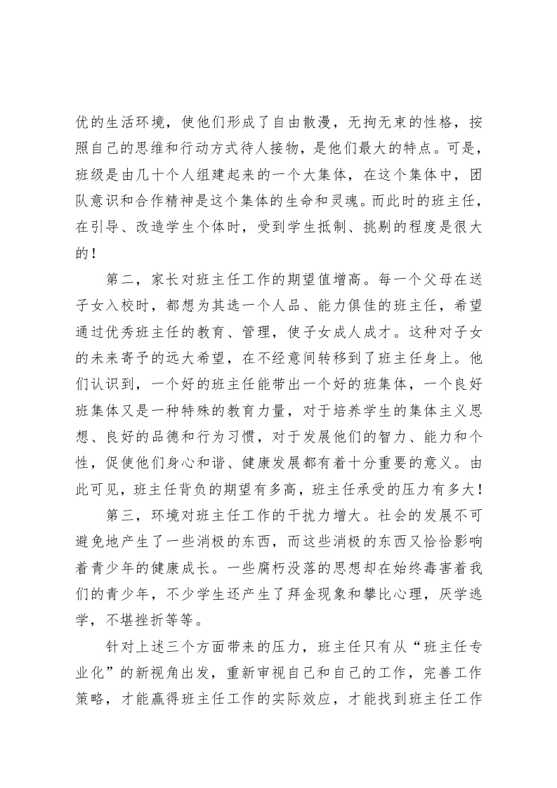 班主任工作会议上,校长讲话如果一味认为问题学生不可救药,或认为他们差就不会对他们产生积极的期望各位领导、各位老师:大家下午好!班主任是学生学习生活的贴心陪伴者。作为班主任,比普通教师更多一份责任,更多一份付出,更多一份酸甜。这份责任、付出与酸甜,就是对学生的教育、指导和关爱。对全班学生从课内到课外,从学习到生活,从个人到家庭,从思想进步到身体的健康成长,无不关心、无不负责,而这一切都在学生身上起着潜移默化的作用。一、班主任工作情况分析“教师工作是辛苦的,班主任的工作更是辛苦。”有人是说自从担任班主任工作以后才真正理解到什么叫“责任”,并由此而带来的压力也与日俱增。我觉得,当前班主任工作形势主要面临着三个方面的压力,如果不对这三个方面的形势有一个清醒的认识和把握,班主任就会在盲目中遇到更多困难和阻力。第一,学生对班主任工作的挑剔度增加。这种挑剔,实际就是对班主任管理的一种“叛逆”,对班主任工作的一种“破坏”。“00后”“10”后的学生,不再“唯师是听”。他们有强烈的自我意识,我们面对的学生大多又为独生子女,养尊处