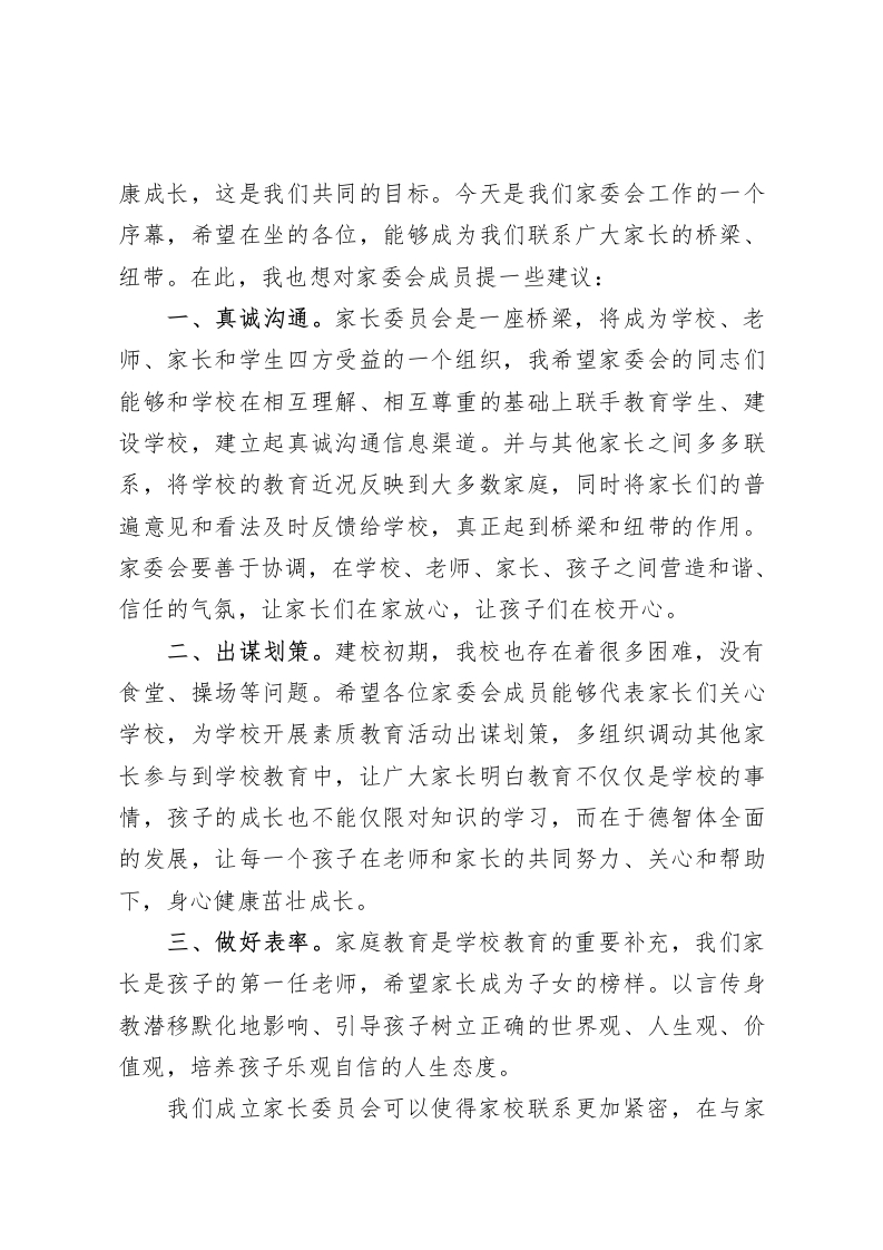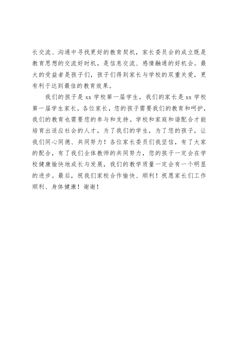 第X届家委会上,校长讲话家长委员会的成立既是教育思想的交流好时机,是信息交流、感情融通的好机会尊敬的家长朋友们:大家下午好!首先,我代表学校欢迎各位家长今天来参加xx学校第X届家长委员会议。非常感谢家长们对我们学校工作的关心和支持!我校是Xx工委、管委会确定的20xx年重点工程项目。学校建设项目自今年3月份确定以来,在社会各界的大力支持下,在各位家长和老师的共同努力下,校建工程进展非常顺利。学校当年建校,当年招生。建校之初,师生暂时借读于Xx实验小学;11月4日,全体师生正式迁入学校本址。按照市委市政府、市教育局与Xx区管委统一部署,xx学校与Xx学校实施合作办学。今年xx学校共派来8名优秀教干教师(其中xx名校长1人,Xx名师2人,市级骨于教师4人,市级学科带头人2人)到Xx学校执教。xx学校也派出8名教师到xx学校执教锻炼。实现了“两校一体”实质性合作。请家长朋友们放心,我们教师都是认真负责的教师,一定会交给大家一份满意的答卷。著名教育家苏霍姆斯基说过,“只有学校教育而没有家庭教育,或者只有家庭教育而没有学校教育,都不能完成培养人这个艰巨而复杂的任务。”让家长了解学校,让家长认可学校,让家长协同学校搞好学校的各项工作,帮助孩子更好更快的健