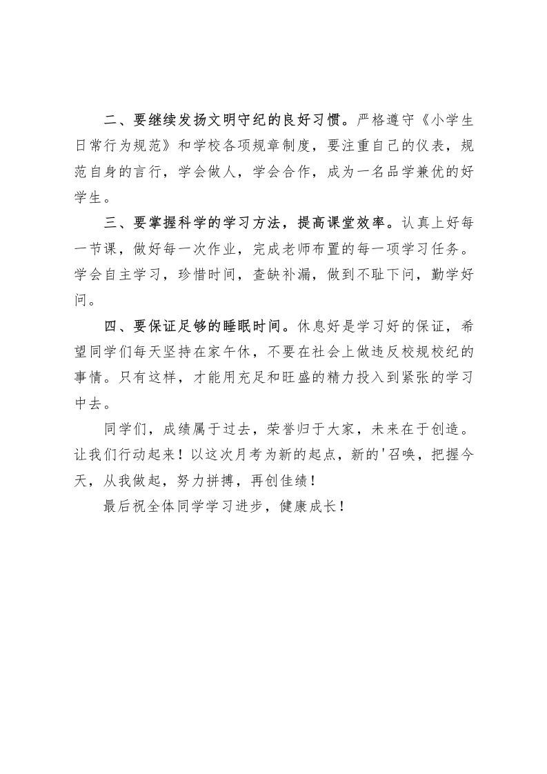 第一次月考后,校长讲话把握今天,从我做起,努力拼搏,再创佳绩老师们、同学们:大家早上好!本学期第一次月考已经结束了,同学们以诚信的态度和良好的考风考纪,向老师、向家长、向学校交了份满意的答卷。今天,我们在这里隆重召开月考成绩表彰大会,表彰成绩优异的同学,希望同学们以优秀学生为榜样,以优异成绩为目标,奋力拼搏,以取得更大更优异的成绩。在此,我代表学校向辛勤耕耘、无私奉献的老师们表示衷心的感谢!向受表彰的同学们表示热烈的祝贺!新学年,面对新的教育形势,我校根据实际情况,制定了明确的奋斗目标:教育教学确保全市第一。为实现此目标,我们的老师爱岗敬业,无私奉献,全身心关爱每一个学生,用辛勤的汗水,换取了同学们的好成绩。广大同学刻苦学习,勇于进取,学习成绩不断上升。我们举行表彰大会,就是要让同学们、老师们看到前阶段的工作成绩,把每一次考试作为新的起点,及时总结,发扬优点,找出差距,更好更快地提高成绩。借此机会,我对同学们提几点希望和要求:一、要继续发扬勤奋学习、刻苦钻研的拼搏精神。端正学习态度,积极主动地学习,发扬顽强拼搏、不怕困难、敢于竞争的精神,勤于思考、善于总结,为进一步提高学习成绩而努力。