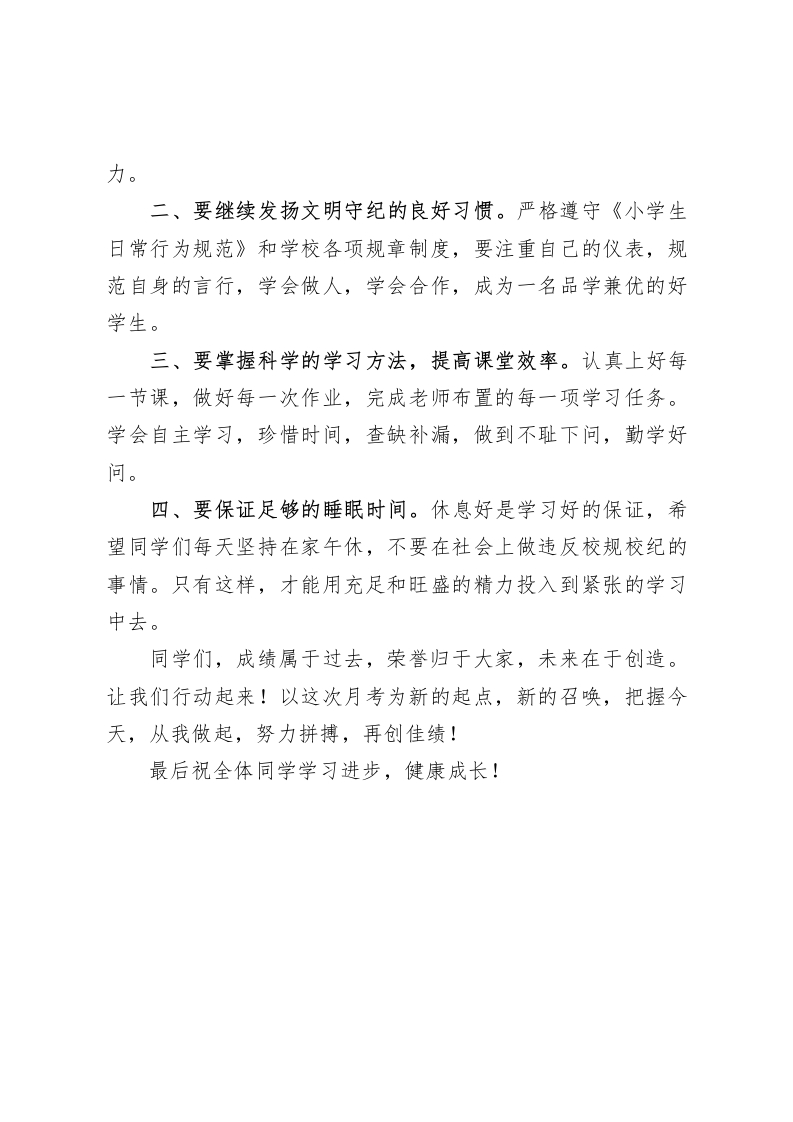 第一次月考结束后,校长在表彰会讲话同学们,成绩属于过去,荣誉归于大家,未来在于创造老师们、同学们:大家早上好!本学期第一次月考已经结束了,同学们以诚信的态度和良好的考风考纪,向老师、向家长、向学校交了份满意的答卷。今天,我们在这里隆重召开月考成绩表彰大会,表彰成绩优异的同学,希望同学们以优秀学生为榜样,以优异成绩为目标,奋力拼搏,以取得更大更优异的成绩。在此,我代表学校向辛勤耕耘、无私奉献的老师们表示衷心的感谢!向受表彰的同学们表示热烈的祝贺!新学年,面对新的教育形势,我校根据实际情况,制定了明确的奋斗目标:教育教学确保全市第一。为实现此目标,我们的老师爱岗敬业,无私奉献,全身心关爱每一个学生,用辛勤的汗水,换取了同学们的好成绩。广大同学刻苦学习,勇于进取,学习成绩不断上升。我们举行表彰大会,就是要让同学们、老师们看到前阶段的工作成绩,把每一次考试作为新的起点,及时总结,发扬优点,找出差距,更好更快地提高成绩。借此机会,我对同学们提几点希望和要求:一、要继续发扬勤奋学习、刻苦钻研的拼搏精神。端正学习态度,积极主动地学习,发扬顽强拼搏、不怕困难、敢于竞争的精神,勤于思考、善于总结,为进一步提高学习成绩而努