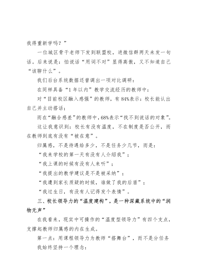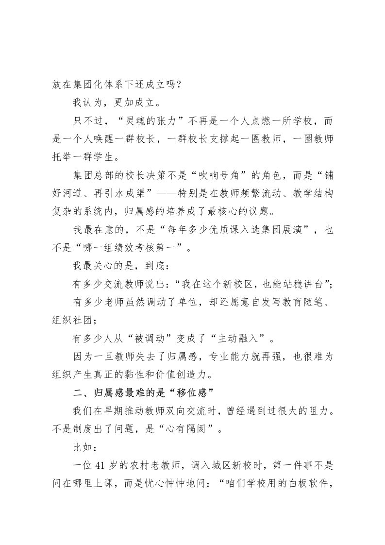集团化办学与校长领导力论坛交流发言:以“有温度”的领导力唤醒教师归属感与教育使命感尊敬的各位教育同仁:大家上午好!很高兴在这样一次教育管理者的对话论坛上,与各位前辈、同仁们深入探讨一个看似柔和,却意义深刻的课题:在集团化办学背景下,校长如何以有温度的领导力,托举起教师内心的归属感。作为一位在集团化体系中摸索耕耘了八年的普通校长,在担任集团教务总负责人期间,我最深的感触是,集团化办学不仅仅是制度的重构,更是治理思维的洗牌。它真正的考验不在管理流程、不在教学计划,而在一一教师的归属感是否能在跨区域流动中“生根发芽”。那种“走遍校区不觉得自己是外人”的能量,是教育最持久的力量。今天这场演讲,我不引用太多概念,不讲架构图,我只想从八年实践过程中的所见、所问、所得,和大家一起来谈:在教书育人这项事业中,我们的校长领导力如何“柔进人心、沉入系统、种入教师的生命线”。一、从“聚是一团火”的愿景落到“拧成一股绳”的现实我们常说,“一个好校长就是一所好学校的灵魂”。这话