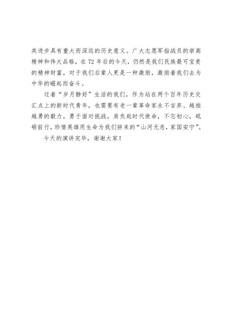 抗美援朝纪念日,校长在国旗下讲话各位老师、亲爱的同学们:大家好!今天是10月25日,也是一个重要的纪念日,即中国人民志愿军抗美援朝76周年。1950年,以美国为首的联合国军将战火燃烧到鸭绿江边,开国领袖一声令下,中国人民志愿军雄赳赳、气昂昂,跨国鸭绿江。同朝鲜人民军并肩作战,战胜了以美国为首的帝国主义侵略者。在环境恶劣、条件艰难,敌人强大,我军弱小的情况下,我军以中国特有的近战、夜战、运动战、枪林弹雨的战场,勇敢穿梭,让敌人惊恐万分。志愿军在朝鲜战场上之所以取得军事胜利,其主要原因就是以国际主义、爱国主义和革命英雄主义为主导的政治工作所产生的精神力量,政治优势成为我军致胜的战略优势。无数先烈、革命前辈们为抗美援朝战争的胜利做出了重大牺牲、贡献,英雄事迹可歌可泣。中国志愿军用他们的顽强而无畏的精神战胜了敌人,也震慑了那些曾经侵略过我们的人。这是史无前例的战争;是穷国打败富国、弱国打败强国创造历史奇迹的战争;是中国军队打出国威、打出军威、打出骨气、扬眉吐气的战争;中国自愿军谱写了中华民族战争史上最光辉的一页,他们不愧是我们最可爱的人。战争的硝烟已经散去,凝炼的民族精神却代代传承。抗美援朝战争对中国是一座历史的丰碑,对维护世界和平、推动人