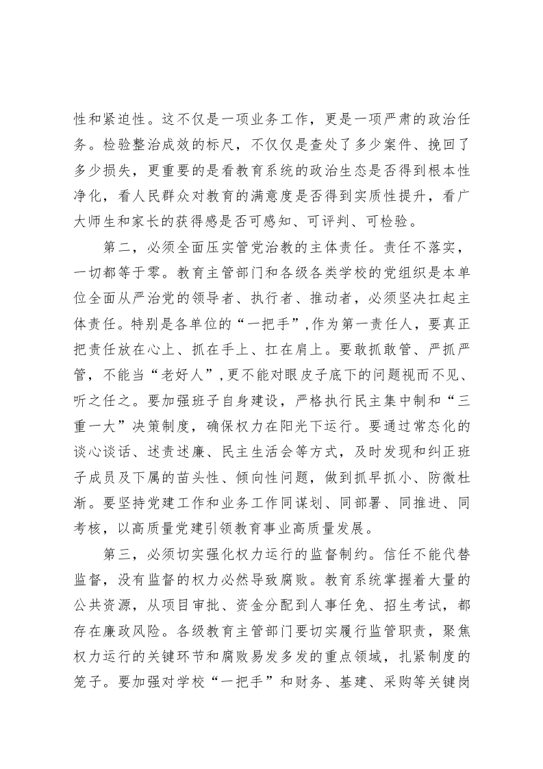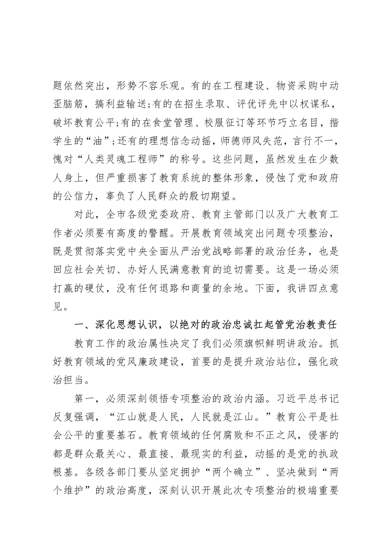 在XX市教育领域突出问题专项整治工作推进会暨领导干部警示教育会议上的讲话(精品)同志们:今天,我们召开全市教育领域突出问题专项整治工作推进会暨领导干部警示教育会议,主要任务是深入学习贯彻习近平总书记关于全面从严治党、关于教育工作的重要论述,分析当前我市教育系统党风廉政建设和反腐败斗争的严峻形势,对专项整治工作进行再动员、再部署、再压实。刚才,市纪委监委通报了专项整治工作进展及近期查处的一批典型案件,市教育局和部分县(市、区)的负责同志作了汇报发言。这些通报和发言,有的揭示了问题的严重性、复杂性,有的分享了工作的初步成效与经验,都值得我们深思和借鉴。教育是国之大计、党之大计,关系着千家万户的期盼,承载着国家与民族的未来。一个地方的教育生态,直接反映其政治生态的优劣,也直接影响着人民群众的获得感、幸福感和安全感。近年来,全市上下在推动教育事业发展方面做了大量工作,取得了有目共睹的成绩,教育发展的总体态势是向好的。然而,成绩的背后,我们必须清醒地看到,教育领域并非一片净土,一些长期存在的顽瘴痼疾尚未根除,不正之风和腐败问题仍时有发生,且呈现出新的特点和形态。从刚才通报的案件和日常监督执纪中发现的情况看,当前我市教育系统存在的问