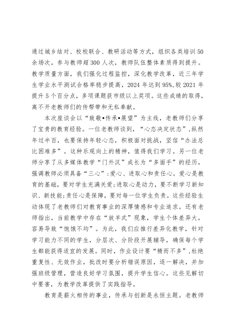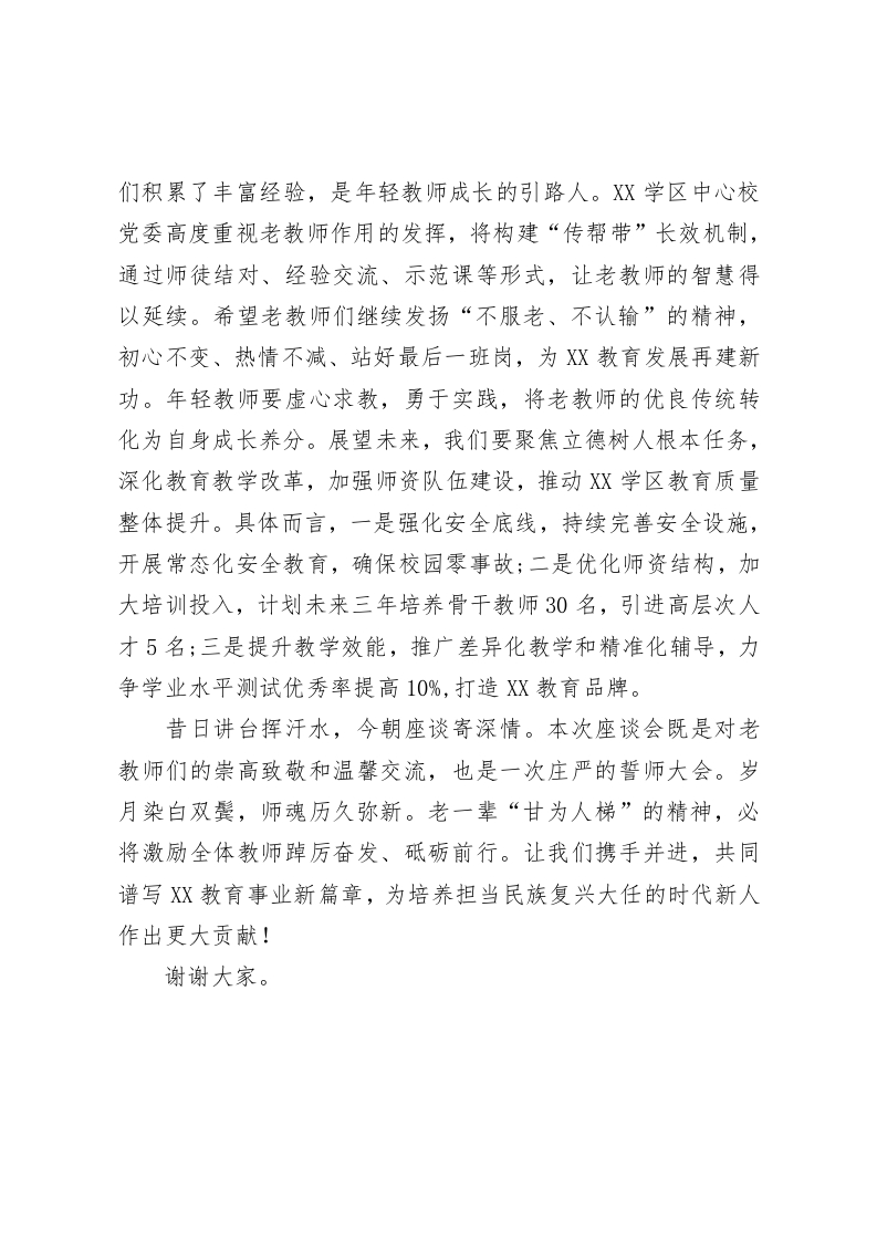 在X学区老教师座谈会上的讲话(精品)同志们:今天,我们齐聚一堂,召开以“育梦岁月长,教泽启新光一一老教师教育经验传承与学校发展共商”为主题的老教师座谈会。此次会议旨在向为XX学区教育事业付出毕生心血的老教师们致以崇高敬意,共同回顾奋斗历程,分享育人智慧,谋划未来发展。我代表XX学区中心校党委,向在座的105位53岁以上的老教师表示衷心感谢和诚挚问候!你们的坚守与奉献,是XX教育事业的宝贵财富和坚实基石。教育是国之大计、党之大计,教师是立教之本、兴教之源。老教师们数十载如一日,扎根基层,默默耕耘,从青丝到白发,将最美年华奉献给了三尺讲台。这种“春蚕到死丝方尽,蜡炬成灰泪始干”的奉献精神,深刻诠释了教育工作者的初心与使命。在XX学区的发展进程中,老教师们不仅是亲历者,更是推动者。你们见证了学校从薄弱走向壮大,从困境迈向辉煌,每一份成就都凝聚着你们的智慧与汗水。近年来,XX学区全体教师戮力同心,在校园安全、师资培养、教学质量提升等方面取得了显著成果。校园安全方面,我们坚持“安全第一、预防为主”的原则,加强人防、物防、技防建设,定期开展安全演练和隐患排查,近三年未发生重大安全责任事故,确保了师生生命安全和校园稳定。师资培养方面,我们注重教师专业成长,