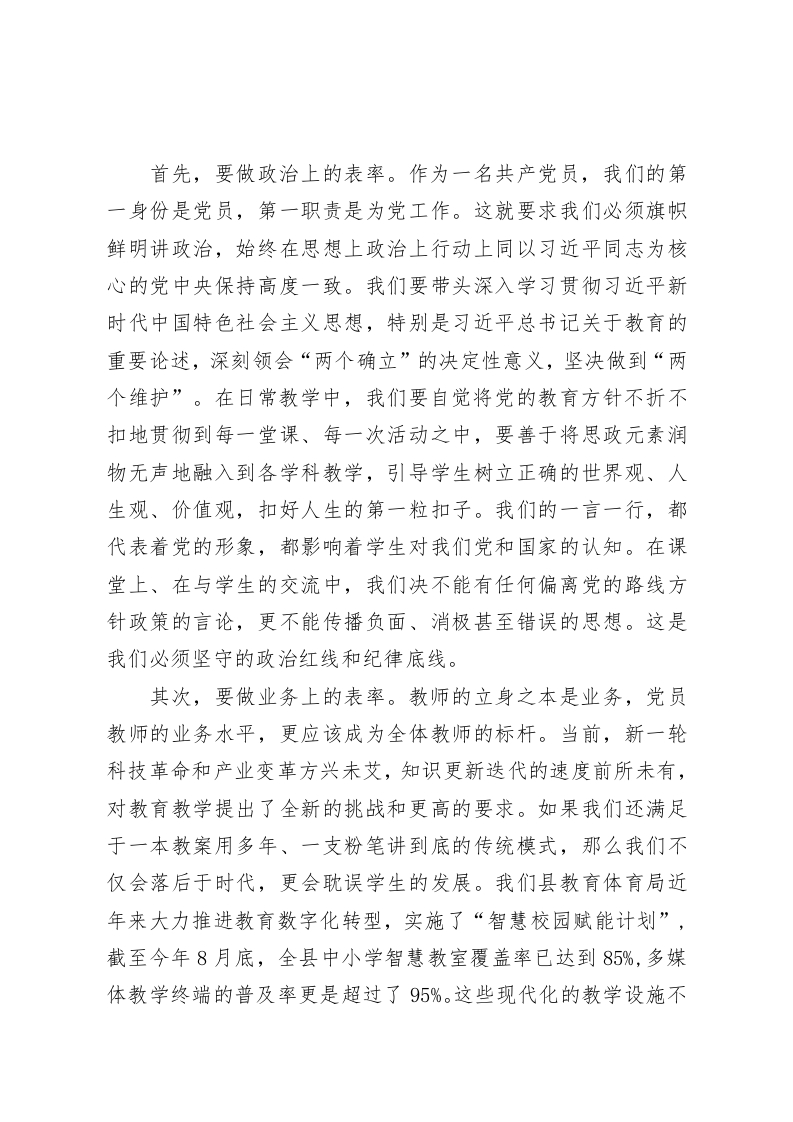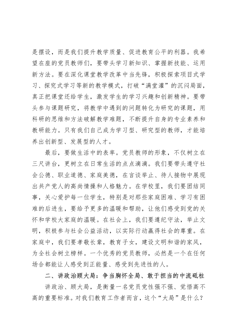 在XX中学专题党课上的讲话:筑牢初心使命,铸就时代师魂(精品)同志们,老师们:下午好。今天,我来到XX乡初级中学,与在座的各位党员教师同志们一同交流,共同上一次专题党课。选择在新的学期刚刚启航的时刻与大家见面,目的非常明确,就是要进一步凝聚思想共识,强化我们作为党员教师的责任与担当,为新学年的各项工作开好局、起好步,注入强大的思想动力。我们党的根基在人民、血脉在人民、力量在人民。作为教育战线上的一线工作者,我们面对的是国家的未来、民族的希望,我们肩负的使命光荣而艰巨。如何在新时代、新征程中,无愧于共产党员这个光荣称号,无愧于人民教师这个神圣职业,是我们每一位同志都必须时刻思考和践行的重大课题。今天,我将围绕“筑牢初心使命,铸就时代师魂”这个主题,结合我们教育体育系统的实际,从四个方面与同志们进行深入的探讨和交流。一、做好表率:争当政治坚定、业务精湛的先锋模范“其身正,不令而行;其身不正,虽令不从。”对于我们党员教师而言,“表率”二字,重千钧。这种表率作用,体现在我们工作、学习、生活的方方面面,它不是一句空洞的口号,而是具体的、实在的行动标准。