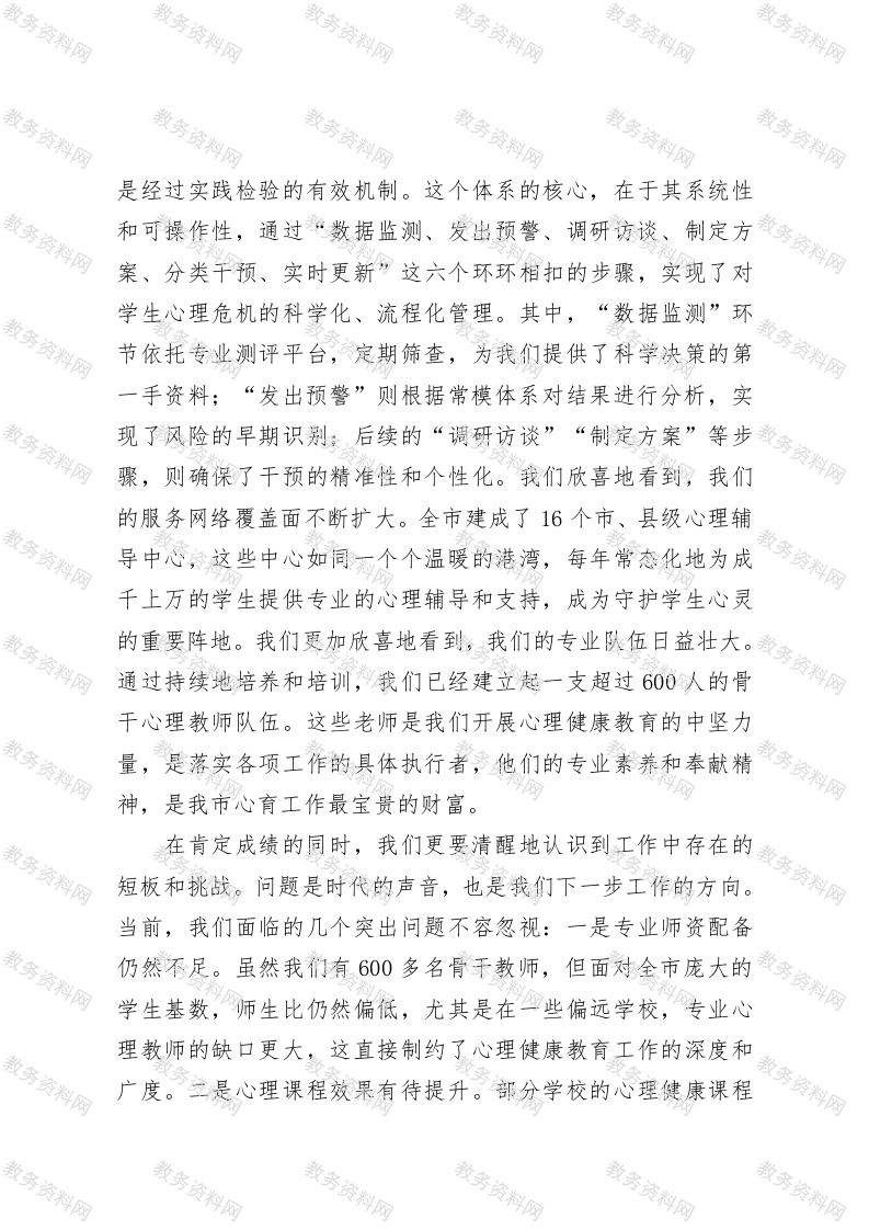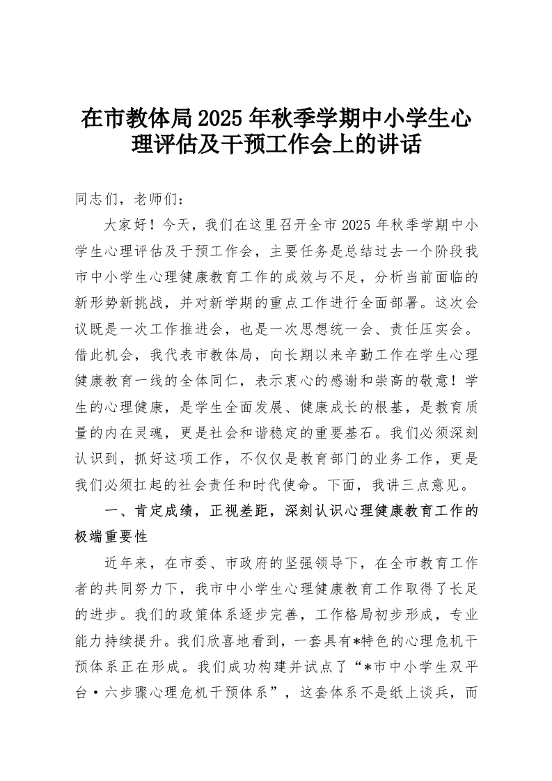 在市教体局2025年秋季学期中小学生心理评估及干预工作会上的讲话同志们,老师们:大家好!今天,我们在这里召开全市2025年秋季学期中小学生心理评估及干预工作会,主要任务是总结过去一个阶段我市中小学生心理健康教育工作的成效与不足,分析当前面临的新形势新挑战,并对新学期的重点工作进行全面部署。这次会议既是一次工作推进会,也是一次思想统一会、责任压实会。借此机会,我代表市教体局,向长期以来辛勤工作在学生心理健康教育一线的全体同仁,表示衷心的感谢和崇高的敬意!学生的心理健康,是学生全面发展、健康成长的根基,是教育质量的内在灵魂,更是社会和谐稳定的重要基石。我们必须深刻认识到,抓好这项工作,不仅仅是教育部门的业务工作,更是我们必须扛起的社会责任和时代使命。下面,我讲三点意见。一、肯定成绩,正视差距,深刻认识心理健康教育工作的极端重要性近年来,在市委、市政府的坚强领导下,在全市教育工作者的共同努力下,我市中小学生心理健康教育工作取得了长足的进步。我们的政策体系逐步完善,工作格局初步形成,专业能力持续提升。我们欣喜地看到,一套具有*特色的心理危机干预体系正在形成。我们成功构建并试点了“*市中小学生双平台·六步骤心理危机干预体系”,这套体系不是纸上谈兵,而