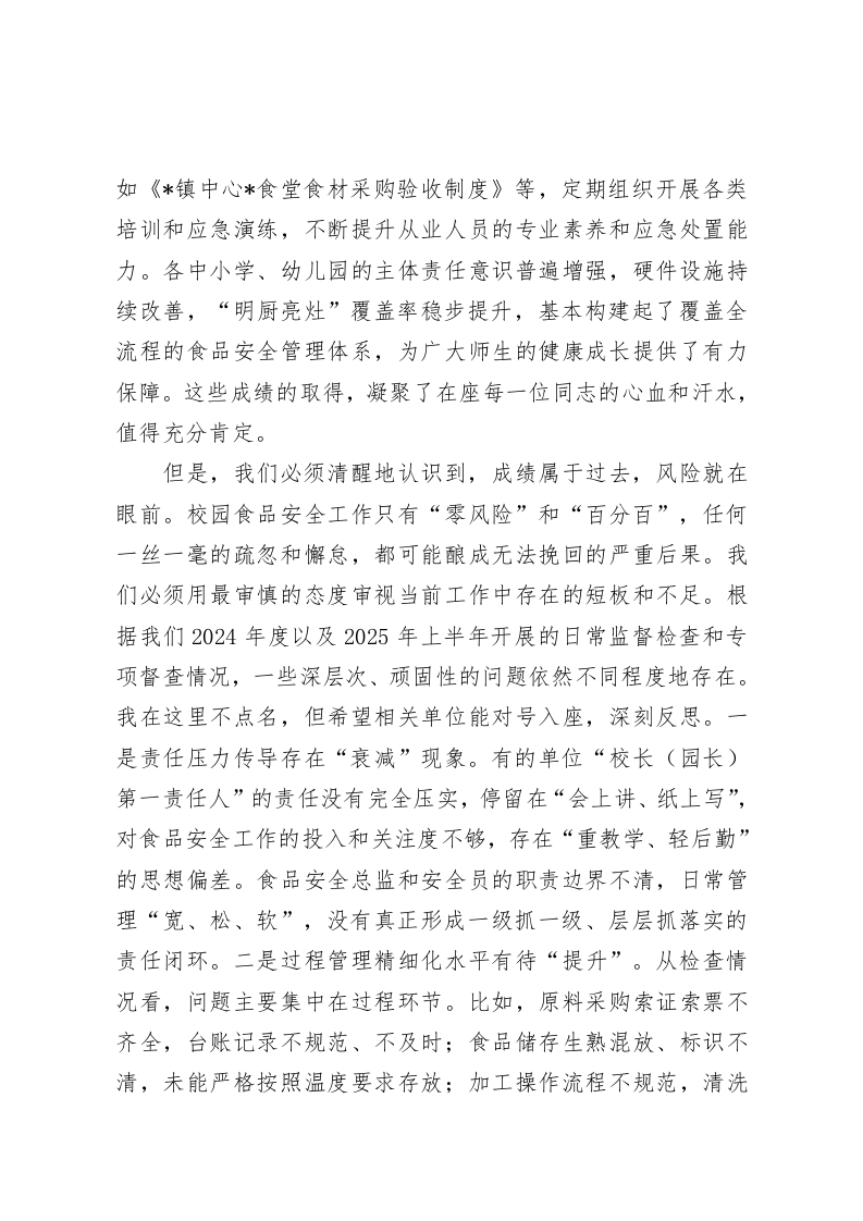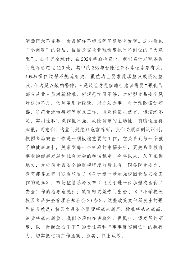 在学区2025年秋季校园食品安全工作培训会议上的讲话同志们:大家下午好!今天,我们在这里隆重召开*镇学区2025年秋季校园食品安全工作培训会议,这既是一次专业知识的“充电赋能”,更是一次工作责任的“加压明责”。首先,我代表*镇学区党委,向莅临指导的*镇长、*所长表示热烈的欢迎和衷心的感谢!向辛勤工作在学区食品安全战线上的各位负责人、管理人员和从业同志们,致以诚挚的问候!校园食品安全,一头连着千家万户的期盼,一头系着社会大局的和谐稳定。这既是必须坚决守住的民生底线,也是不容有失的政治红线。刚才,市场监督管理所的*所长结合生动的案例和丰富的实践经验,为我们作了非常专业、极具操作性的专题培训,内容详实,指导具体,大家要认真领会,深入消化。稍后,*镇长还将为我们作重要讲话,为我们下一步的工作指明方向、提出要求,我们一定要不折不扣地抓好贯彻落实。借此机会,结合学区当前校园食品安全工作的实际情况,我讲三点意见。一、认清形势,正视问题,深刻把握校园食品安全工作的极端重要性近年来,在镇党委、政府的坚强领导和市场监督管理所的专业指导下,在学区各单位的共同努力下,我们学区校园食品安全工作总体态势平稳向好。我们建立健全了各项管理制度,