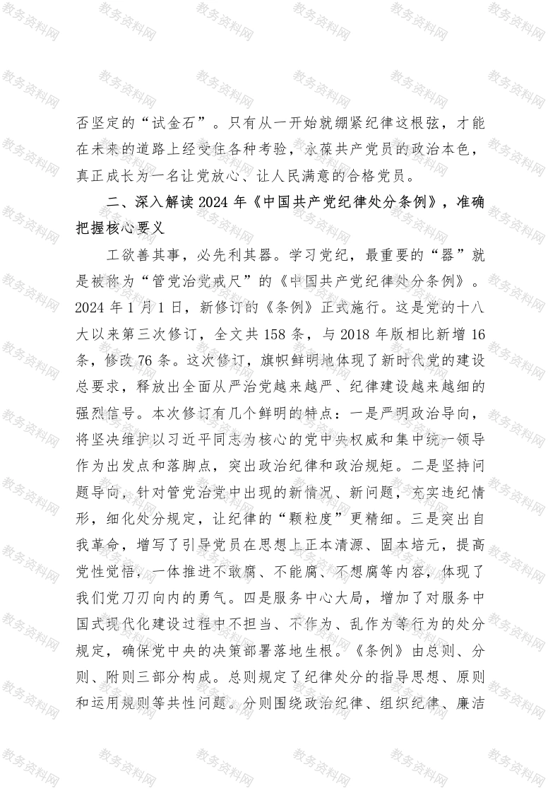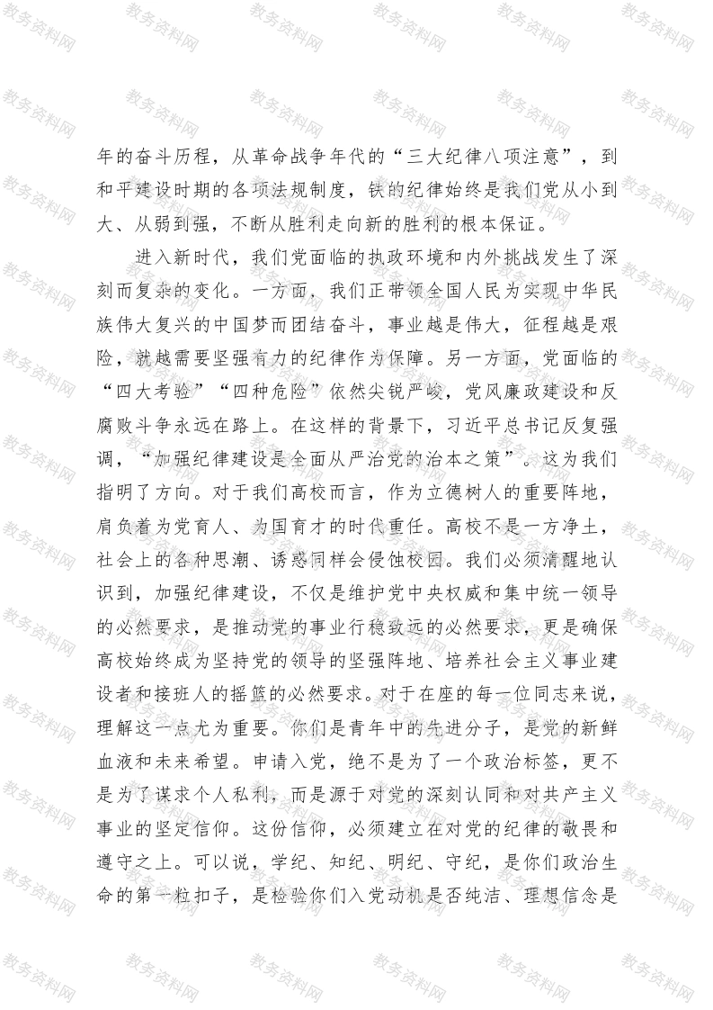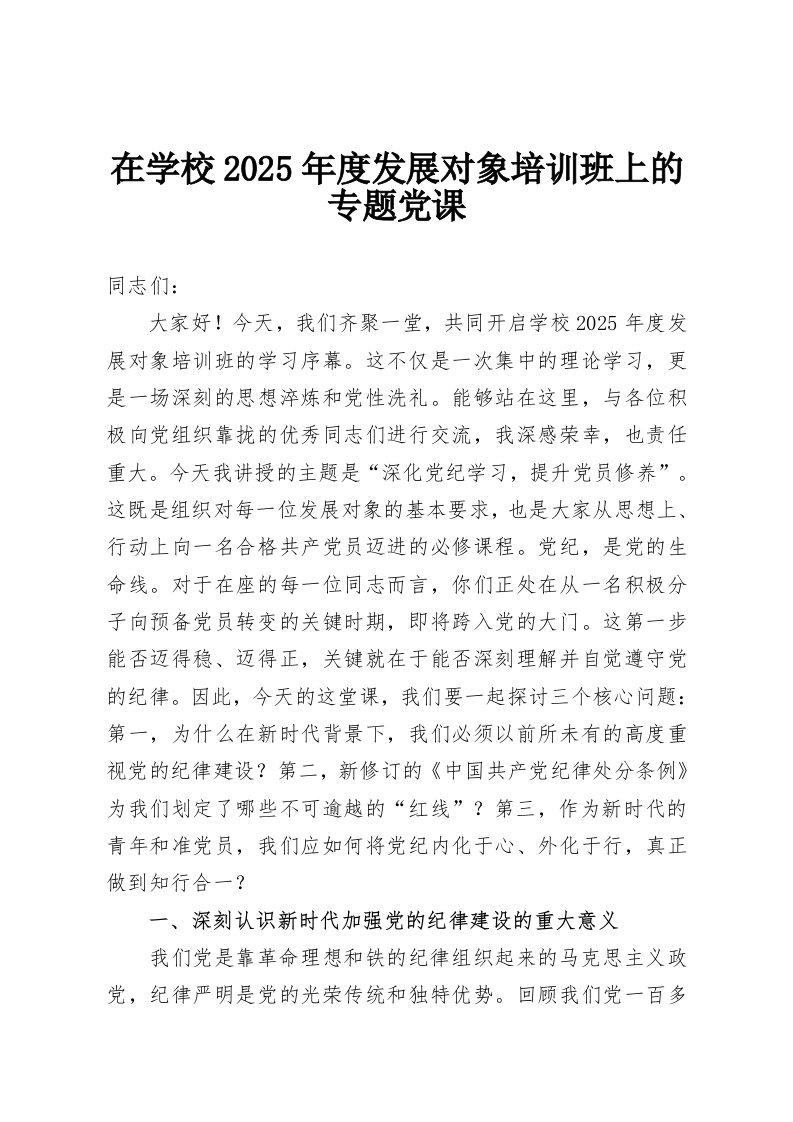 在学校2025年度发展对象培训班上的专题党课同志们:大家好!今天,我们齐聚一堂,共同开启学校2025年度发展对象培训班的学习序幕。这不仅是一次集中的理论学习,更是一场深刻的思想淬炼和党性洗礼。能够站在这里,与各位积极向党组织靠拢的优秀同志们进行交流,我深感荣幸,也责任重大。今天我讲授的主题是“深化党纪学习,提升党员修养”。这既是组织对每一位发展对象的基本要求,也是大家从思想上、行动上向一名合格共产党员迈进的必修课程。党纪,是党的生命线。对于在座的每一位同志而言,你们正处在从一名积极分子向预备党员转变的关键时期,即将跨入党的大门。这第一步能否迈得稳、迈得正,关键就在于能否深刻理解并自觉遵守党的纪律。因此,今天的这堂课,我们要一起探讨三个核心问题:第一,为什么在新时代背景下,我们必须以前所未有的高度重视党的纪律建设?第二,新修订的《中国共产党纪律处分条例》为我们划定了哪些不可逾越的“红线”?第三,作为新时代的青年和准党员,我们应如何将党纪内化于心、外化于行,真正做到知行合一?一、深刻认识新时代加强党的纪律建设的重大意义我们党是靠革命理想和铁的纪律组织起来的马克思主义政党,纪律严明是党的光荣传统和独特优势。回顾我们党一百多