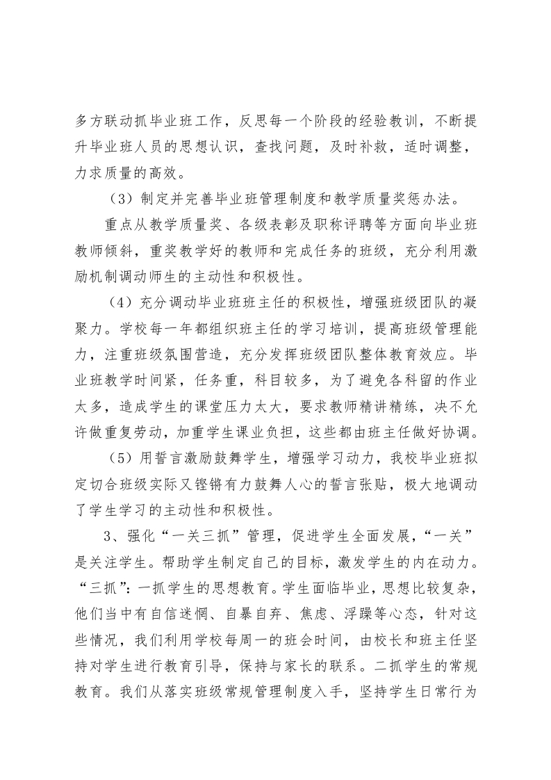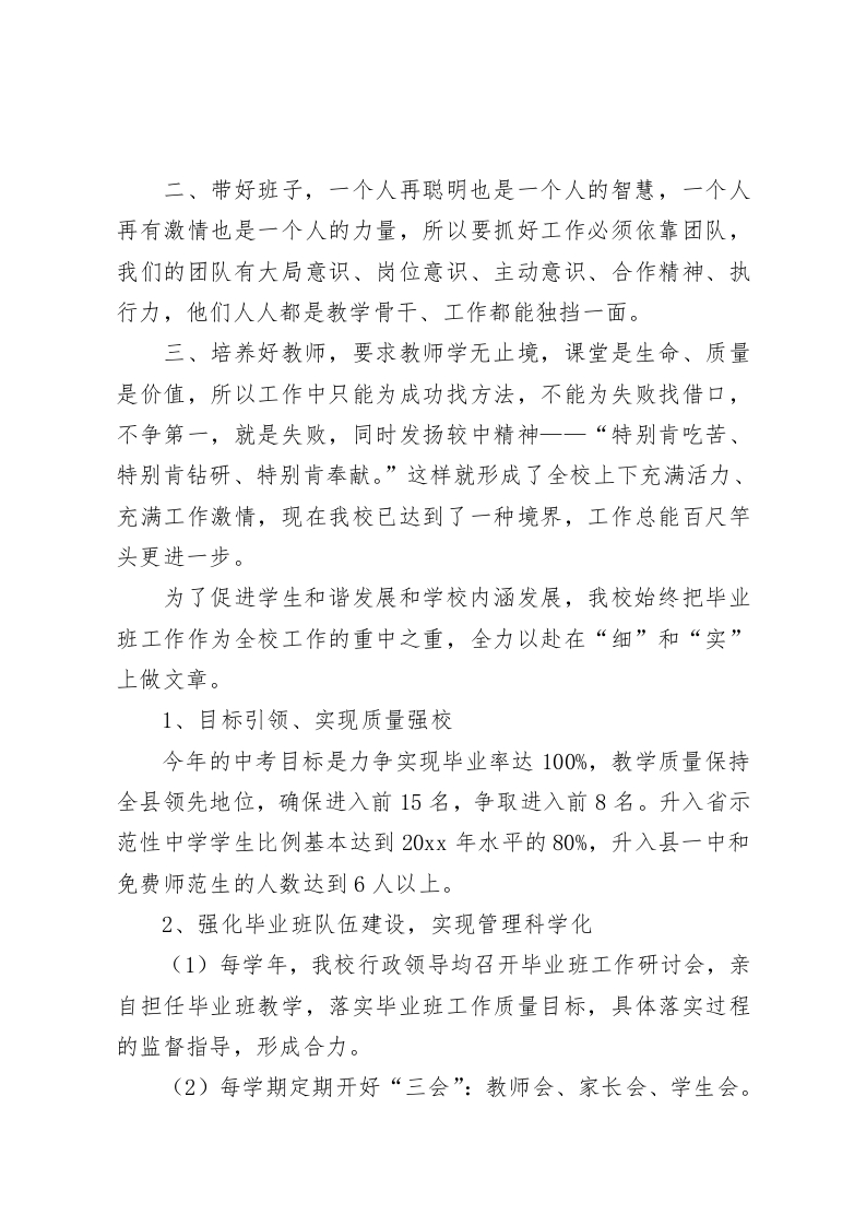 初三兄弟学校交流会议,校长汇报讲话,主要讲了本校毕业班工作是怎样做的、怎样管理的尊敬的各位领导、各位老师:大家好!多年来,Xx学校教学质量不断创优。成绩的取得倾注了各位领导的心血,也凝结了全校教职员工的汗水和智慧!借此机会,我想代表中学全体教职员工向一贯关心和支持中学的各位领导表示衷心的感谢,同时也向此次为我们提供交流学习现场的中学、向不吝赐教的兄弟学校的老师们表示衷心的感谢!面对各位领导的殷切期望,面对广大群众对优质教育的迫切愿望,面对多年来我们取得的骄人的中考成绩,对我们来说是个不小的压力。前任九年级教师的拼搏精神对我们来说也是一种压力,面对压力我们诚惶诚恐,唯恐我们不能很好地传承他们的精神,巩固超越他们的成绩。因此,我今天的发言仅作为抛砖引玉,把我校毕业班工作是怎样做的、怎样管理的向大家作一个汇报。一、教育不是一蹴而就,它需要文化的沉淀、外部环境的影响,同时更需要有校长的统领能力、责任意识、战略眼光和人格魅力,需要有优秀的教师团队,学校才能逐步走向成功。学校要成功,校长至关重要,校长要有精、气、神,校长要提出目标,要有达成目标的计划,要有目标完成的现实结果,这样才给教职工一种力量和信心。