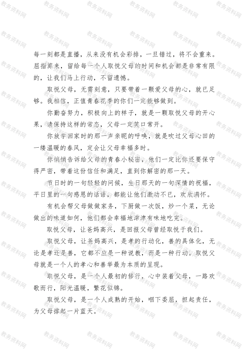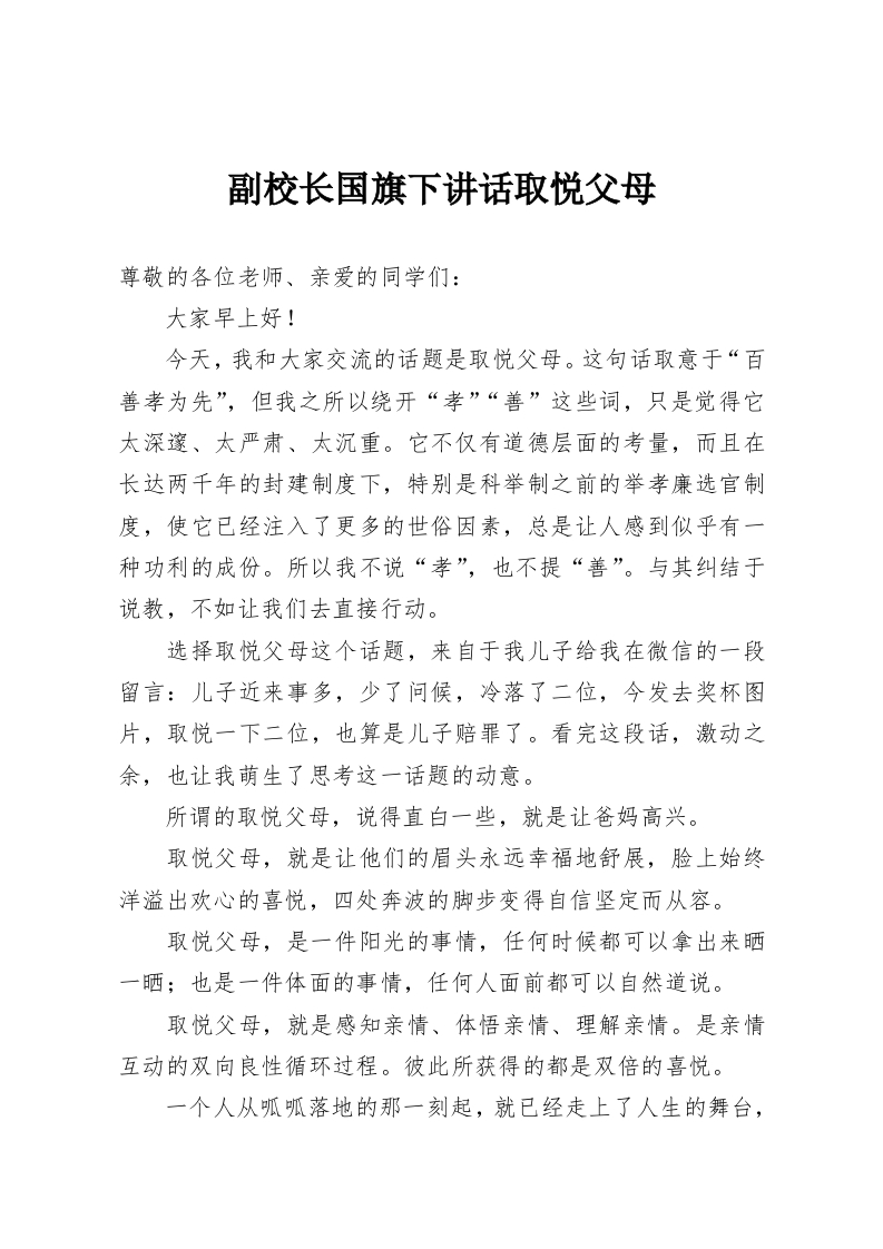 副校长国旗下讲话取悦父母尊敬的各位老师、亲爱的同学们:大家早上好!今天,我和大家交流的话题是取悦父母。这句话取意于“百善孝为先”,但我之所以绕开“孝”“善”这些词,只是觉得它太深邃、太严肃、太沉重。它不仅有道德层面的考量,而且在长达两千年的封建制度下,特别是科举制之前的举孝廉选官制度,使它已经注入了更多的世俗因素,总是让人感到似乎有一种功利的成份。所以我不说“孝”,也不提“善”。与其纠结于说教,不如让我们去直接行动。选择取悦父母这个话题,来自于我儿子给我在微信的一段留言:儿子近来事多,少了问候,冷落了二位,今发去奖杯图片,取悦一下二位,也算是儿子赔罪了。看完这段话,激动之余,也让我萌生了思考这一话题的动意。所谓的取悦父母,说得直白一些,就是让爸妈高兴。取悦父母,就是让他们的眉头永远幸福地舒展,脸上始终洋溢出欢心的喜悦,四处奔波的脚步变得自信坚定而从容。取悦父母,是一件阳光的事情,任何时候都可以拿出来晒一晒;也是一件体面的事情,任何人面前都可以自然道说。取悦父母,就是感知亲情、体悟亲情、理解亲情。是亲情互动的双向良性循环过程。彼此所获得的都是双倍的喜悦。一个人从呱呱落地的那一刻起,就已经走上了人生的舞台,