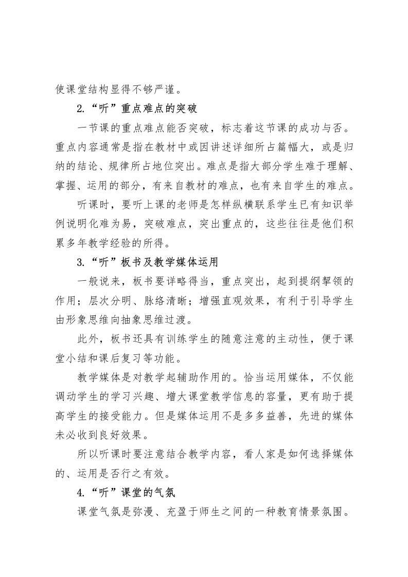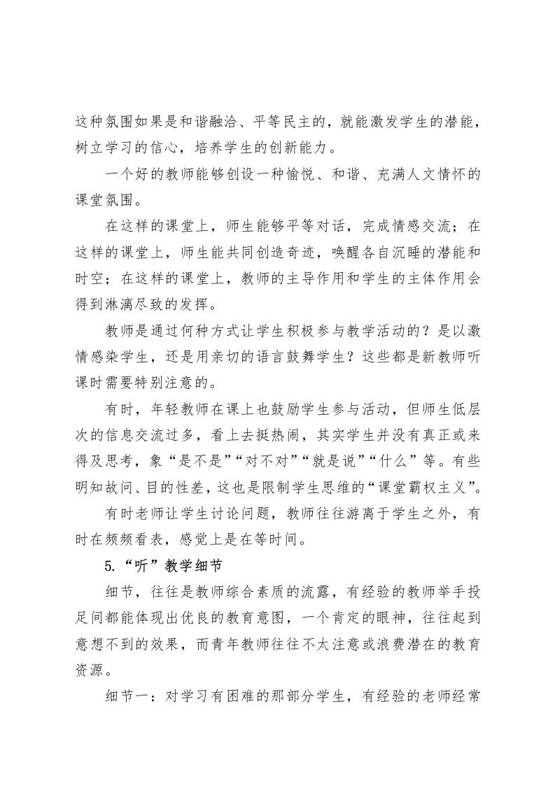 副校长讲话教师之间听课,到底听什么、记什么各位老师:新学期到来已有一月余,学校内的以及校际之间的教研活动已陆续正常的开展起来,我们将会去参与听课活动。所谓“教无定法,贵在得法。”我们在听课时,要特别注意去品悟师生教和学的方法与技巧,特别是品悟教师如何运用并组合教法,品悟不同学生在课堂上的思维类型、学习心理、学习方法和认知规律。今天的教师会议的主题是:教师之间听课,到底听什么、记什么?1.“听”课的结构课的结构是指课的组成部分及各部分的顺序和时间分配。课型不同,课的结构也不同。我们在听课时,要看他们怎样安排课堂结构,教学目标在何时采用何种方式呈现才能最大限度地引起学生的好奇,激发学生的学习动机;如何通过课堂提问使学生有意识地从认知结构中提取相关的旧知识,并激活旧知识。怎样创设教学情境,导入新课的教学;怎样通过简明、准确、生动的语言系统呈现新内容;采用何种方式完成对新内容的巩固;如何设计多种形式的练习,加强知识的应用与迁移。除了注意每个环节的实现方式,还要注意时间安排,否则就会出现一节课“前紧后松”或“前松后紧”的不合理状况,