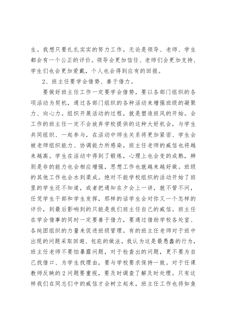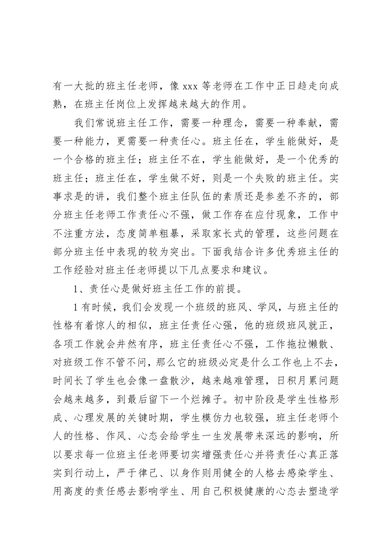 副校长在班主任会议上讲话认认真真做事只能把事做对,用心做事才能把事做好各位班主任:当前,学校已经进入了一个良性发展的最佳时期,从外部环境上说,上级对学校的投入不断加大,我们现在很多建设项目都得到了上级领导的大力支持并得以实施。上级教育主管部门对我校工作更是给予充分肯定,这些都为学校发展提供了非常好的外部环境和发展机遇。从内部环境来看,学校内部团结向上、教师工作热情高涨,各项管理井然有序成为全县典范,学校工作蒸蒸日上。这一切都与我们全体班主任老师的努力是分不开的,是班主任为学校工作打好了坚实的基石。我们在共同见证学校发展历程的同时也在共同书写着学校的历史。班级是学校发展的重要基础,学校工作的提升支撑点在班级。建立一支观念新、能力强、作风正、素质高的班主任队伍,是学校的打造品牌、塑造形象、健康发展的根本,更是我校一直以来努力追求的工作目标。常规管理作为学生管理中的关键环节,工作最为繁琐,但全体班主任教师广开思路、抓实抓好常规的过程性管理,常规管理工作成效显著。像xxx等老师所带的班级常规管理扎实有效,纪律、卫生等方面都走在了我校的前列。正是班主任这项富有挑战性的工作锻炼了我们的队伍,才