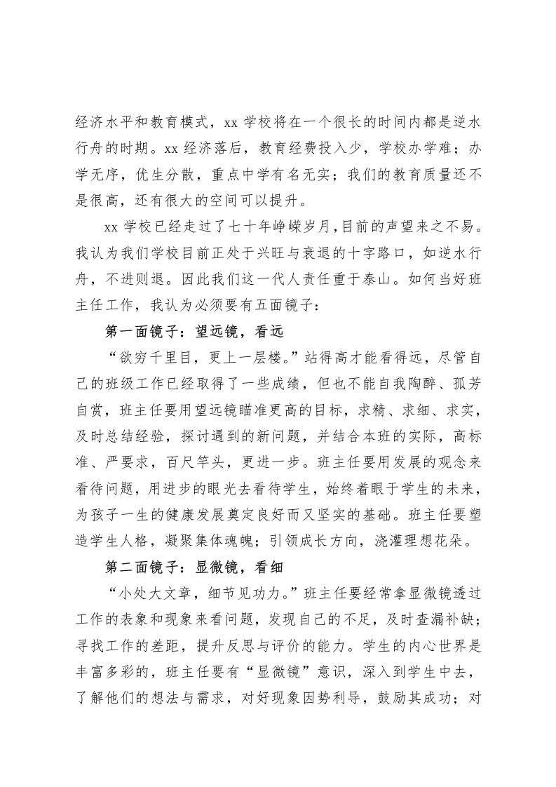 副校长在第X次班主任会议上讲话,引用5面镜子望远镜,显微镜,放大镜,太阳镜,哈哈镜尊敬的各位班主任老师:大家上午好!今天是第X次班主任大会,在我们教育圈流传着这样一句话:全校十天半个月校长离开外出开会学习,学校都不会出问题;哪个班一天没有班主任那个班肯定出问题。这句话说得没错,足见班主任对学校工作,对学生成长的重要性。今年的第一次班主任会议上,我想和各位班主任老师谈谈心,沟通一下我们对班主任工作的认识,谈一谈关于责任的话题。在我们学校,班主任工作至关重要是我们全体师生和家长的共识。学生进校选班就是要选班主任,班主任强则班级强,班级强则年级强,年级强则学校强。很多时候看到我们的班主任老师起早摸黑、来去匆匆,我都非常感动。有时听到有些家长和学生非议我们的班主任,我又非常的心痛。看到一个称职的班主任带出了成功的班级,我从内心里感到高兴和自豪;看到有些不是很认真的班主任荒废了班级和学生,我有时感到很愤怒,很自责,觉得愧对学生和家长。不是一家人不吃一锅饭。我们今天坐在这儿,我们就与xx学校荣辱与共了。xx校长经常说我们Xx学校还没有度过危险期,我是极力认同这一观念的。而且我个人认为按照目前xx的
