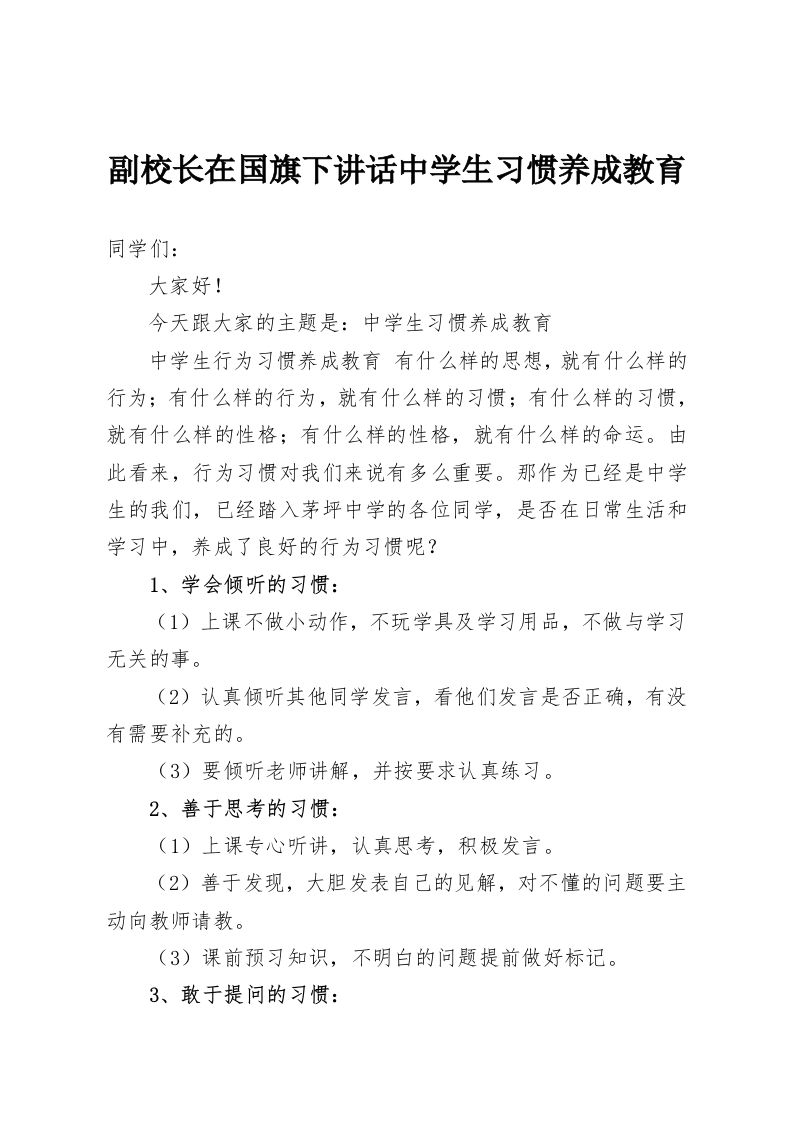 副校长在国旗下讲话中学生习惯养成教育同学们:大家好!今天跟大家的主题是:中学生习惯养成教育中学生行为习惯养成教育有什么样的思想,就有什么样的行为;有什么样的行为,就有什么样的习惯;有什么样的习惯,就有什么样的性格;有什么样的性格,就有什么样的命运。由此看来,行为习惯对我们来说有多么重要。那作为已经是中学生的我们,已经踏入茅坪中学的各位同学,是否在日常生活和学习中,养成了良好的行为习惯呢?1、学会倾听的习惯:(1)上课不做小动作,不玩学具及学习用品,不做与学习无关的事。(2)认真倾听其他同学发言,看他们发言是否正确,有没有需要补充的。(3)要倾听老师讲解,并按要求认真练习。2、善于思考的习惯:(1)上课专心听讲,认真思考,积极发言。(2)善于发现,大胆发表自己的见解,对不懂的问题要主动向教师请教。(3)课前预习知识,不明白的问题提前做好标记。3、敢于提问的习惯: