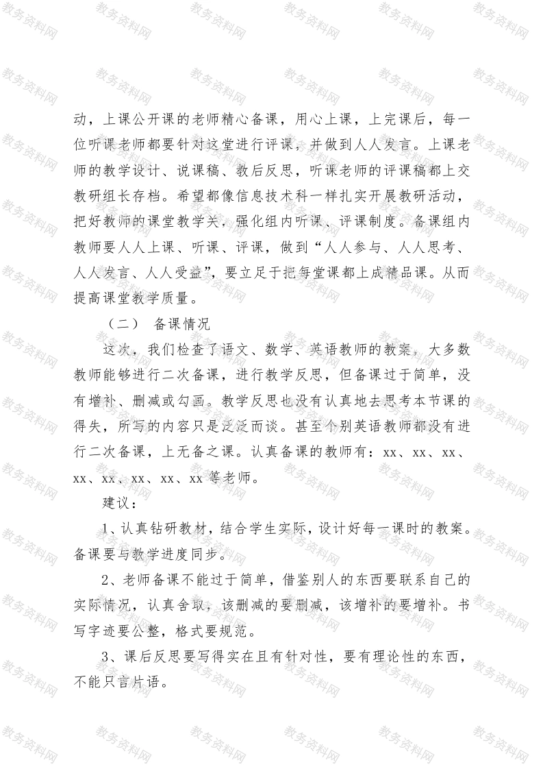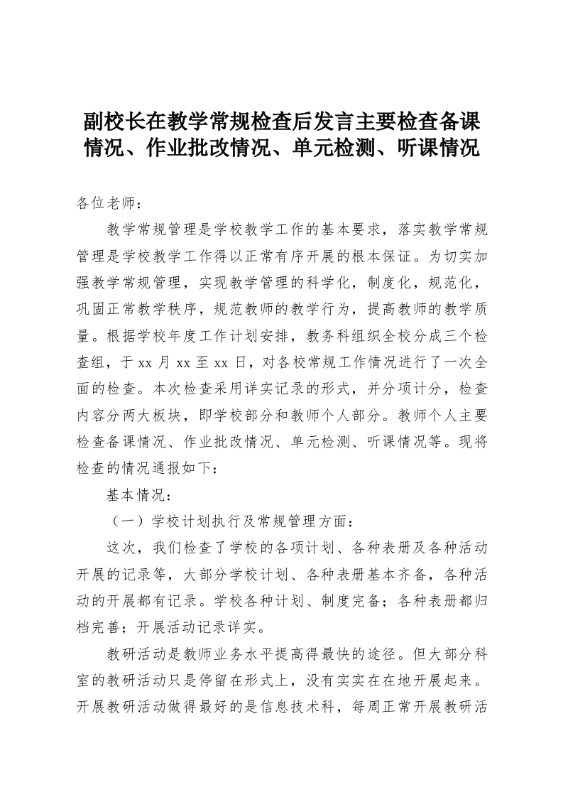 副校长在教学常规检查后发言主要检查备课情况、作业批改情况、单元检测、听课情况各位老师:教学常规管理是学校教学工作的基本要求,落实教学常规管理是学校教学工作得以正常有序开展的根本保证。为切实加强教学常规管理,实现教学管理的科学化,制度化,规范化,巩固正常教学秩序,规范教师的教学行为,提高教师的教学质量。根据学校年度工作计划安排,教务科组织全校分成三个检查组,于xx月xx至Xx日,对各校常规工作情况进行了一次全面的检查。本次检查采用详实记录的形式,并分项计分,检查内容分两大板块,即学校部分和教师个人部分。教师个人主要检查备课情况、作业批改情况、单元检测、听课情况等。现将检查的情况通报如下:基本情况:(一)学校计划执行及常规管理方面:这次,我们检查了学校的各项计划、各种表册及各种活动开展的记录等,大部分学校计划、各种表册基本齐备,各种活动的开展都有记录。学校各种计划、制度完备;各种表册都归档完善;开展活动记录详实。教研活动是教师业务水平提高得最快的途径。但大部分科室的教研活动只是停留在形式上,没有实实在在地开展起来。开展教研活动做得最好的是信息技术科,每周正常开展教研活