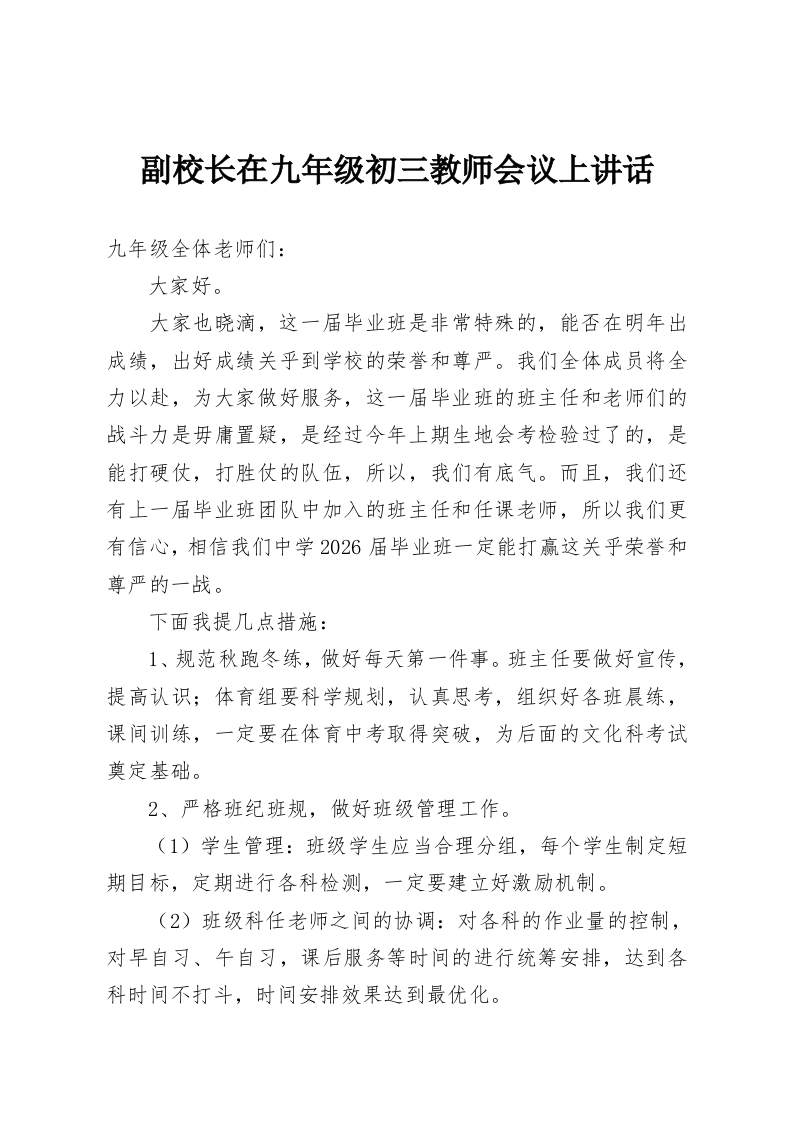 副校长在九年级初三教师会议上讲话九年级全体老师们:大家好。大家也晓滴,这一届毕业班是非常特殊的,能否在明年出成绩,出好成绩关乎到学校的荣誉和尊严。我们全体成员将全力以赴,为大家做好服务,这一届毕业班的班主任和老师们的战斗力是毋庸置疑,是经过今年上期生地会考检验过了的,是能打硬仗,打胜仗的队伍,所以,我们有底气。而且,我们还有上一届毕业班团队中加入的班主任和任课老师,所以我们更有信心,相信我们中学2026届毕业班一定能打赢这关乎荣誉和尊严的一战。下面我提几点措施:1、规范秋跑冬练,做好每天第一件事。班主任要做好宣传,提高认识;体育组要科学规划,认真思考,组织好各班晨练,课间训练,一定要在体育中考取得突破,为后面的文化科考试奠定基础。2、严格班纪班规,做好班级管理工作。(1)学生管理:班级学生应当合理分组,每个学生制定短期目标,定期进行各科检测,一定要建立好激励机制。(2)班级科任老师之间的协调:对各科的作业量的控制,对早自习、午自习,课后服务等时间的进行统筹安排,达到各科时间不打斗,时间安排效果达到最优化。