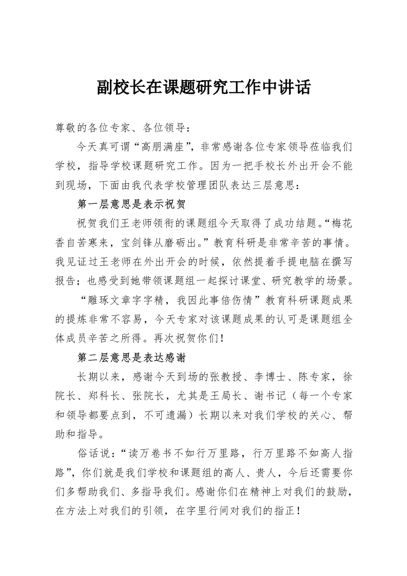 副校长在课题研究工作中讲话尊敬的各位专家、各位领导:今天真可谓“高朋满座”,非常感谢各位专家领导莅临我们学校,指导学校课题研究工作。因为一把手校长外出开会不能到现场,下面由我代表学校管理团队表达三层意思:第一层意思是表示祝贺祝贺我们王老师领衔的课题组今天取得了成功结题。“梅花香自苦寒来,宝剑锋从磨砺出。”教育科研是非常辛苦的事情。我见证过王老师在外出开会的时候,依然提着手提电脑在撰写报告;也感受到她带领课题组一起探讨课堂、研究教学的场景。“雕琢文章字字精,我因此事倍伤情”教育科研课题成果的提炼非常不容易,今天专家对该课题成果的认可是课题组全体成员辛苦之所得。再次祝贺你们!第二层意思是表达感谢长期以来,感谢今天到场的张教授、李博士、陈专家,徐院长、郑科长、张院长,尤其是王局长、谢书记(每一个专家和领导都要点到,不可遗漏)长期以来对我们学校的关心、帮助和指导。俗话说:“读万卷书不如行万里路,行万里路不如高人指路”,你们就是我们学校和课题组的高人、贵人,今后还需要你们多帮助我们、多指导我们。感谢你们在精神上对我们的鼓励,在方法上对我们的引领,在字里行间对我们的指正!
