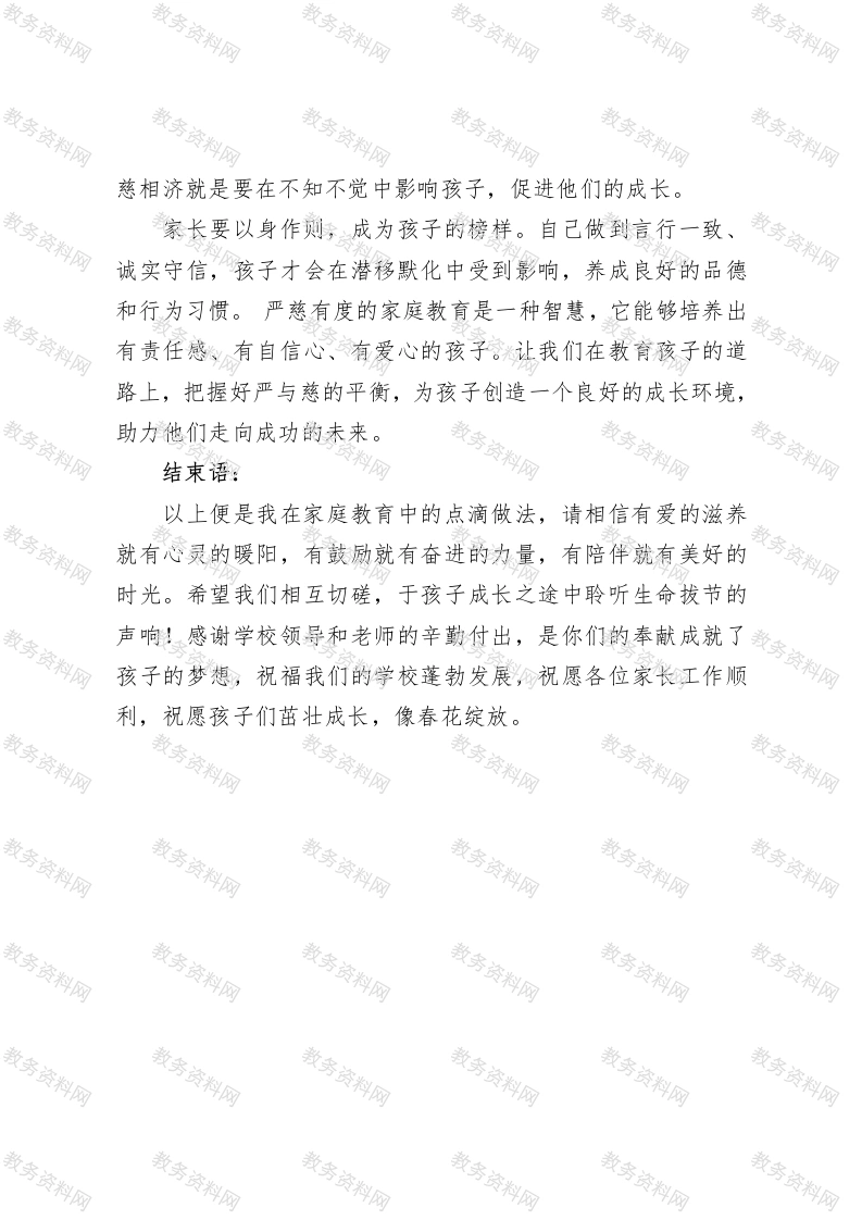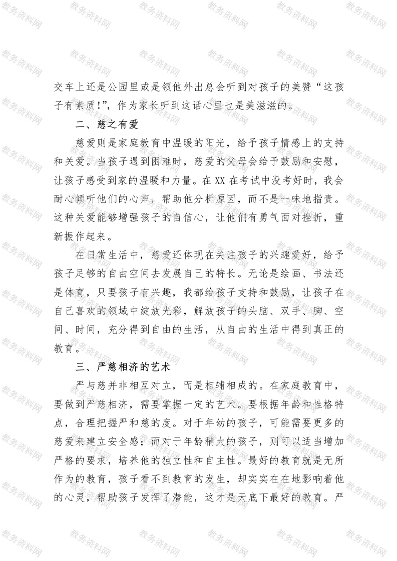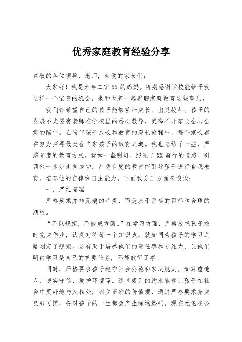 优秀家庭教育经验分享尊敬的各位领导、老师,亲爱的家长们:大家好!我是六年二班XX的妈妈。特别感谢学校能给予我这样一个宝贵的机会,来和大家一起聊聊家庭教育这些事儿。我们都希望自己的孩子能够茁壮成长、出类拔萃。孩子的发展不光要有老师在学校里的悉心教导,更离不开家长全心全意的陪伴。在陪伴孩子成长和教育的漫长旅程中,每个家长都在努力探寻最契合自家孩子的教育之道。我也总结了一些,严慈有度的教育方式,犹如一盏明灯,照亮了XX前行的道路,引领他一步步走向成功。严慈有度的教育能引导孩子进行自我教育,培养他的自律和自主能力。下面我分三方面来谈谈:一、严之有理严格要求并非无端的苛责,而是基于明确的目标和合理的期望。“不以规矩,不能成方圆。”在学习方面,严格要求孩子按时完成作业,认真对待每一个知识点,就如同为孩子的学习之路划定了规矩。这有助于培养他们的责任感和专注力,让他们明白学习是自己的首要任务,不能敷衍了事。同时,严格要求孩子遵守社会公德和家庭规则。如尊重他人、诚实守信、爱护环境等。这些规则的约束能够让孩子在社会中更好地与人相处,树立正确的价值观,通过严格要求养成良好习惯,将对孩子的一生都会产生深远影响。现在无论在公