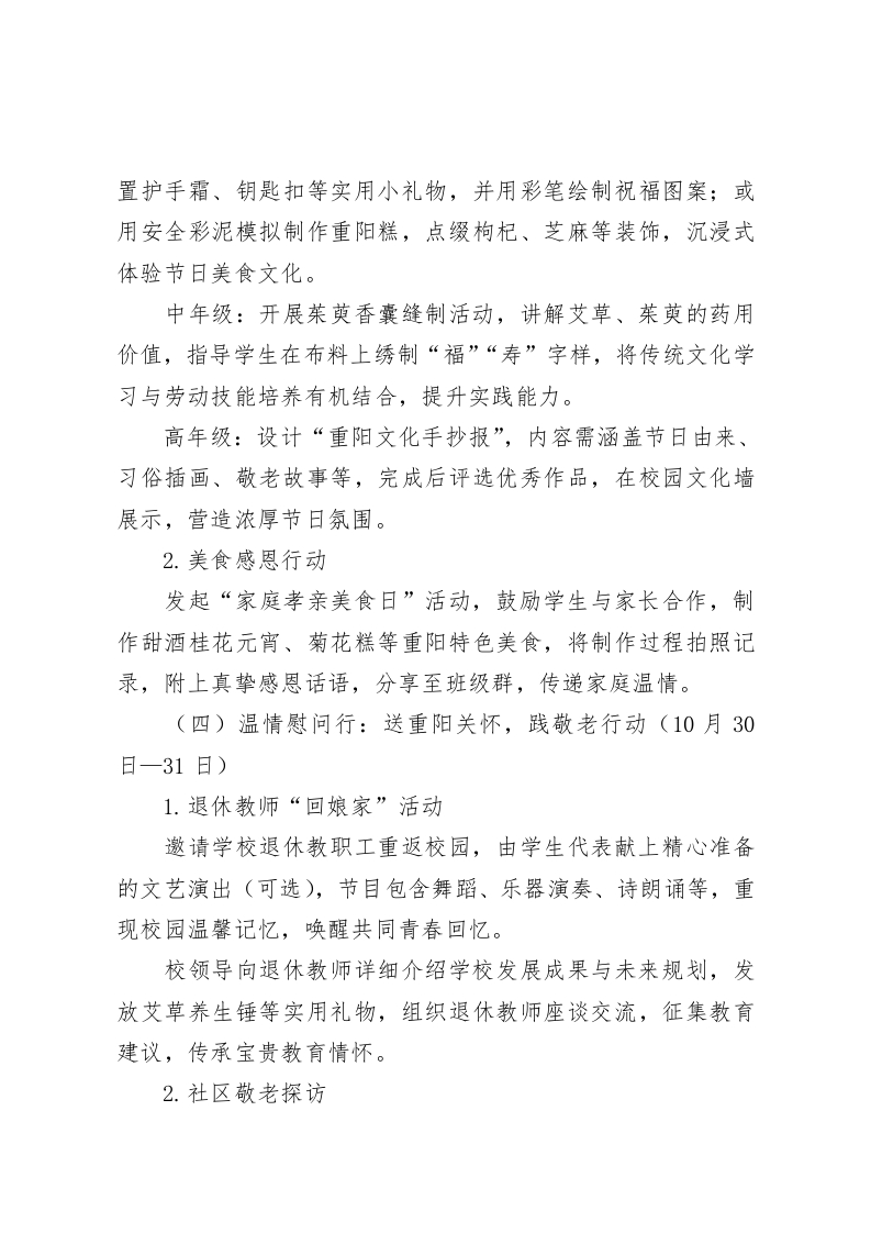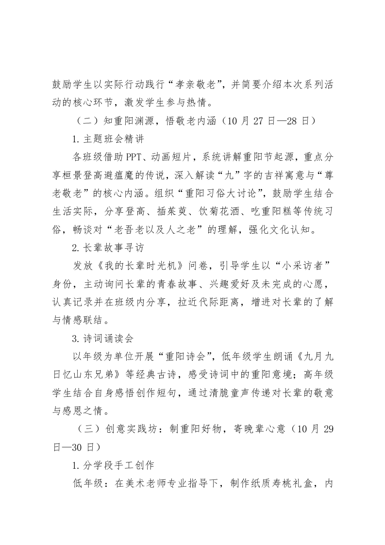 重阳敬老行,美德代代传2025年XX中小学重阳节活动方案一、活动主题重阳敬老行,美德代代传二、活动宗旨传承中华民族尊老敬老的传统美德,深化学生对重阳节文化内涵的理解,通过“认知-创作-实践-传承”的递进式活动,让学生在动手实践中习得技能,在情感互动中懂得感恩,将“孝亲敬老”的种子根植于心、外化于行,构建家校社协同的育人氛围。三、活动时间2025年10月27日一10月31日四、参与对象XX中小学全体师生五、活动内容(一)启动仪式:主题升旗仪式(10月27日,周一)作为活动开篇,以庄严的升旗仪式拉开重阳节系列活动序幕,明确活动意义与目标,营造全员参与的浓厚氛围:1.主题宣讲:由学生代表围绕“重阳敬老”主题发言,结合历史故事与生活实例,阐述重阳节文化内涵及尊老敬老的时代意义,号召全体同学积极参与后续活动。2.校长寄语:校长发表讲话,强调传统美德传承的重要性,