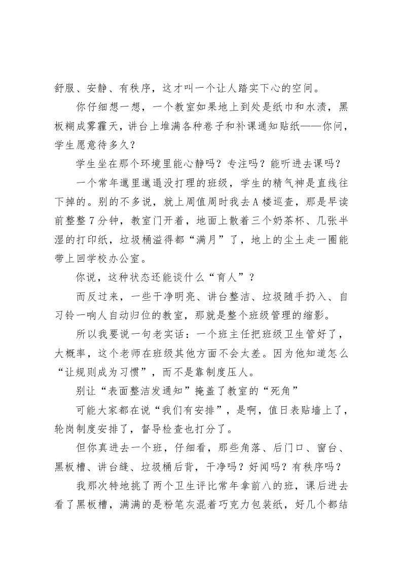 德育(政教)副校长在班主任会议上的讲话:一块抹布的背后,是德育的根基?各位老师,下午好。今天我们再聚在一起,聊一聊“班级卫生”的话题。这个工作其实贯穿全年,但你说具体放到哪个阶段真正坐下来“严肃当回事儿”的,不多。有人可能会想:不就是扫扫地、擦擦黑板,学生自己轮流做的事,至于开会专门讲吗?我一开始当班主任的时候想的也是这个意思,但干了十来年我越来越觉得,卫生这个事儿,其实背后挑着三样特别大的东西:一个叫“管理能力”;一个是“学生习惯”;还有一个,就是我们整个班级的“精神面貌”。所以今天这个会,我也不想套模版,不讲通报,不读文件。我就想把平时看到的一些问题、我们做得不错的地方、还有实打实暴露出来的断档,一块摆在台面上说一说。希望这趟会下来,我们对这个事儿至少能达成共识,接下去就能动一步,动实了。卫生是教室的第一面“镜子”我总说,教室是学生的“第二个家”。但这其实不是一句好听话,而是一个责任提醒。什么叫家?就是你愿意在里面坐着,愿意留下来,干净、