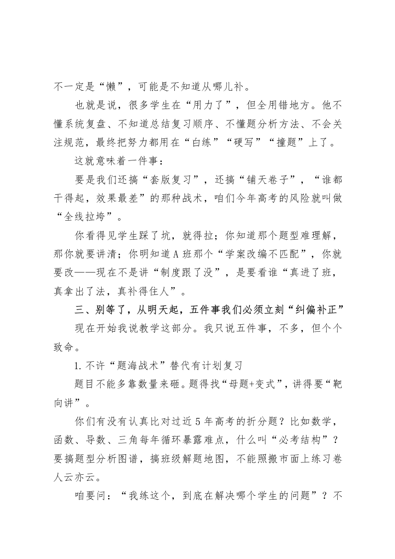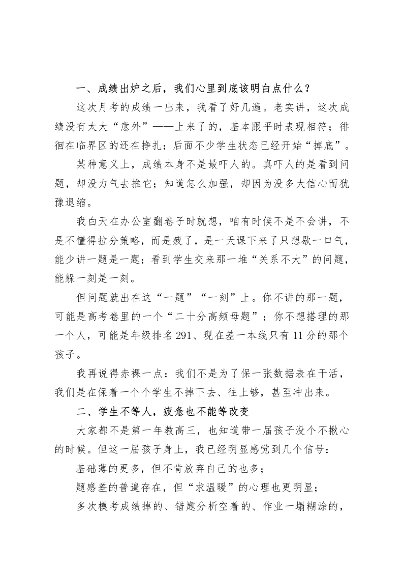 副校长在高三第一次月考质量分析会上的讲话:剩下238天,备考路径图现场划重点,干货满满!各位高三老师,下午好。我本来打算准备一页纸的讲话稿,后来发现我其实写不出来。不是不知道该说什么,而是觉得讲稿写得越规整,好像心里越空空的。因为我们现在面对的,不是一个学期的任务,也不是一张成绩单能够说明的工作压力。我们现在所有的辛苦、投入、焦虑,最后要靠一场考试去兑现。而那场考试,不在九个月以后,不在暑假过后,就在238天之后。这238天是啥?不是数字,是我们争分夺秒、咬牙扛事、一起背责的日子。高三这一年,不是多跑了几趟教室、改了几张卷子那么简单,而是我们手上牵着的是几个年级,甚至几百个家庭的希望。你可以说学生有主动性问题,可以说政策不确定;但讲到底一一我们这些高三老师,就是他们的最后一张底牌;说得再实在点,我们就是他们能不能撑过去的“关键变量”。我今天说的话,不是布置工作、也不是总结成效。我们别那么空。我就是想踏踏实实、一条一条把最近看到的问题、听到的担忧,以及我心里觉得该怎么干的路径,都拿出来掰一掰、摆一摆。
